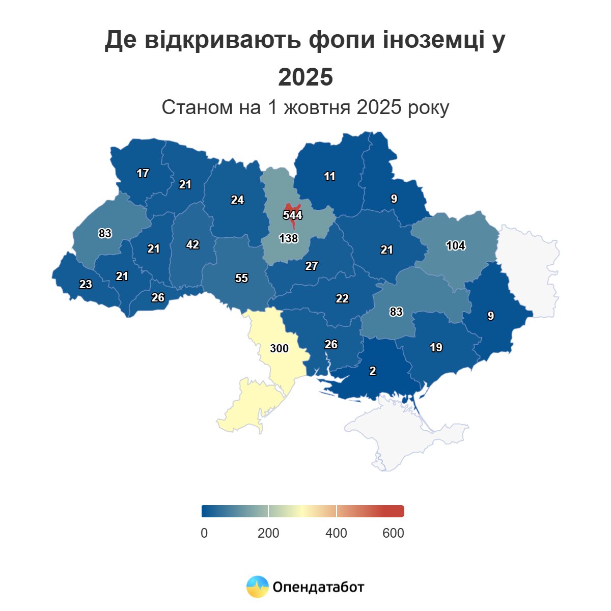 За перші дев'ять місяців 2025 року понад 1,6 тисячі іноземців зареєстрували бізнес в Україні. Серед регіонів найбільшу активність демонструє Київ, а на Одещині відкрили понад 300 підприємств-нерезидентів.