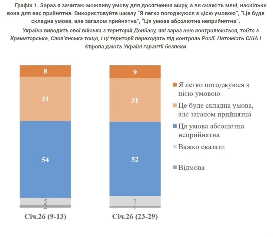 Як відзначили у КМІС, у середині січня показники щодо територіальних поступок були майже ідентичні, тобто протягом 2-х останніх тижнів попри масштабні обстріли та проблеми з електро- та теплопостачанням, підтримка такої вимоги до миру не зросла.
