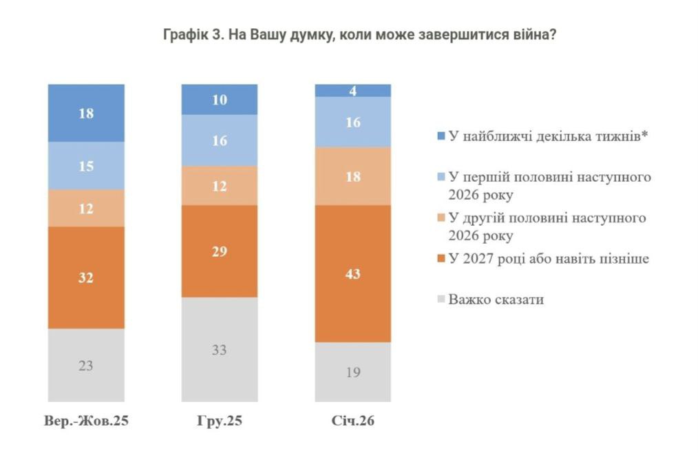 При цьому у вересні-жовтні 2025 року 33% очікували, що війна може закінчитися не пізніше першої половини 2026 року, у грудні 2025 року так вважали – уже 26%. Зараз – 20%, тобто все менше людей очікують на завершення до середини 2026 року.