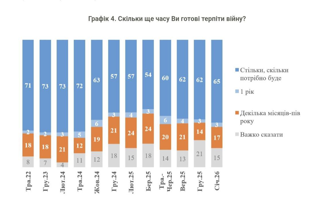 При цьому більшість українців (65%) продовжують відповідати, що вони готові терпіти війну стільки, скільки потрібно. Про більш короткий період (пів року чи декілька місяців) говорять 17% респондентів.