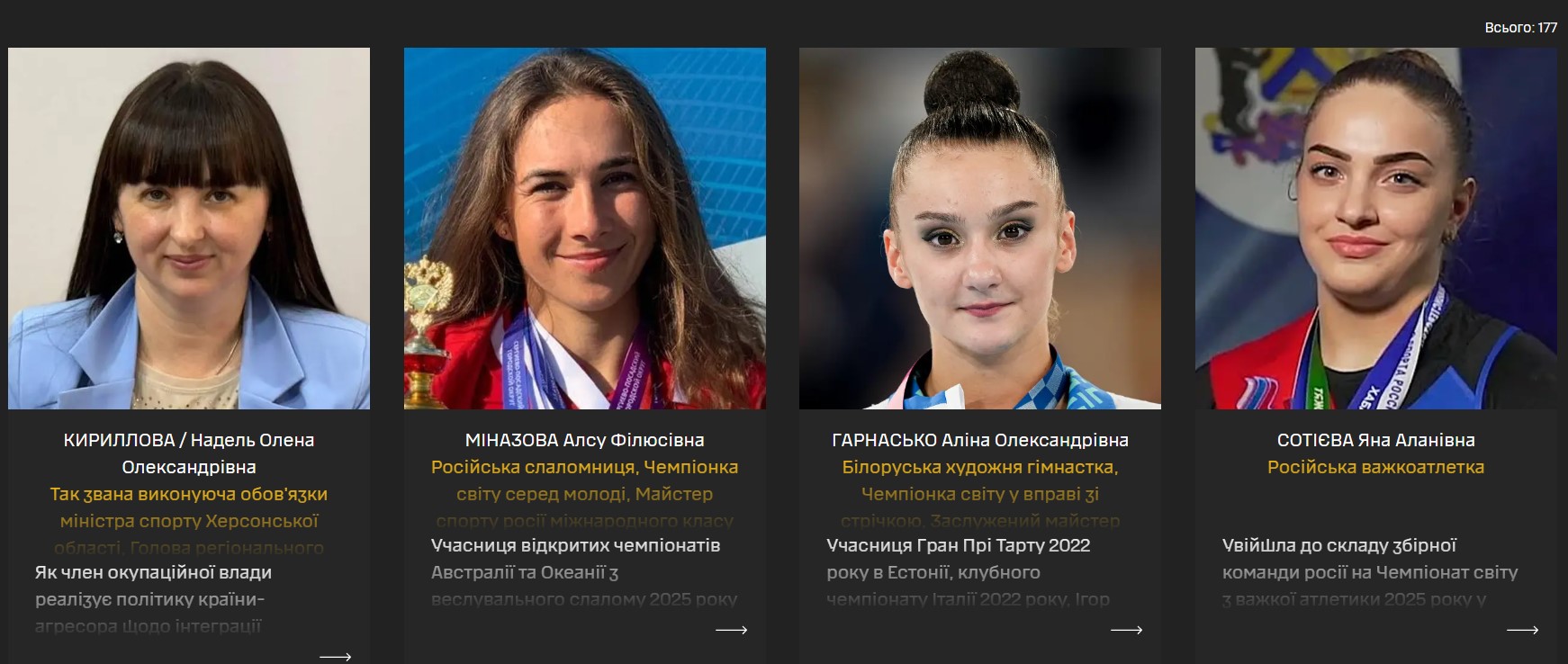 Розділ «Чемпіони терору» порталу War&Sanctions вже містить інформацію про 177 спортсменів та функціонерів, причетних до пропаганди війни.