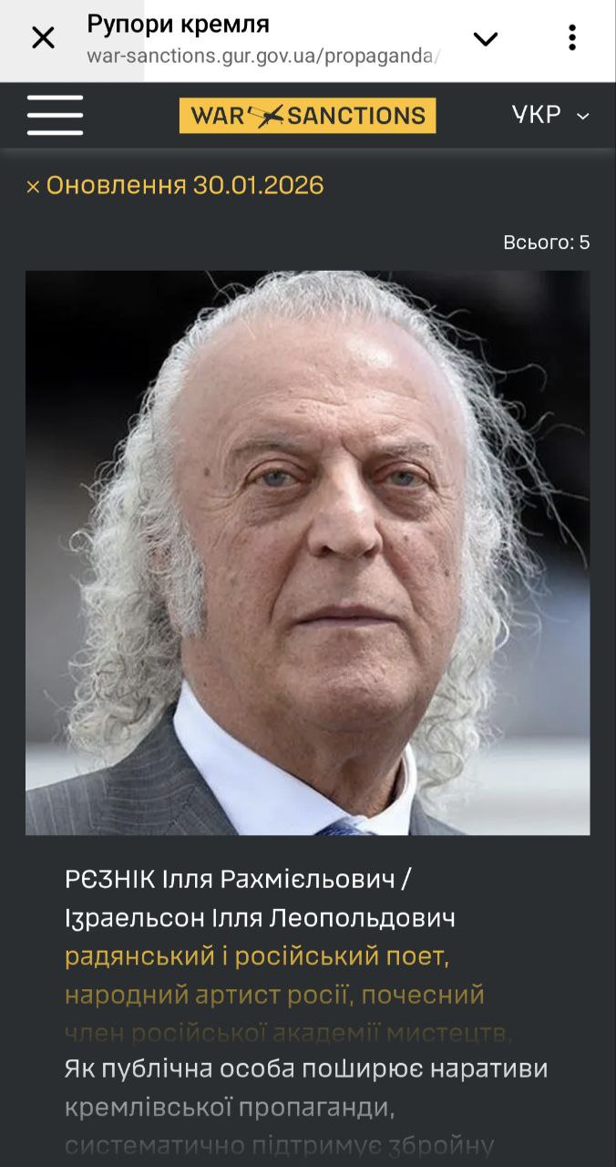 ГУР поповнив перелік російських пропагандистів War&Sanctions трьома новими іменами. У розділі «Рупори кремля» з'явилися дані незмінного ведучого програми «поле чудєс» Леоніда Якубовича, поета-пісенника Іл'ї Рєзніка та артиста «уральскіх пєльмєнєй» Андрія Рожкова.