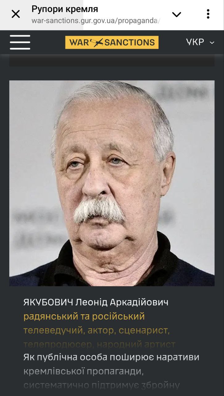 Якубовіч Лєонід Аркадієвіч – радянський та російський телеведучий, народний артист росії, член партії “єдіная росія”, який використовує телешоу як платформу для демонстрації підтримки російських військових.