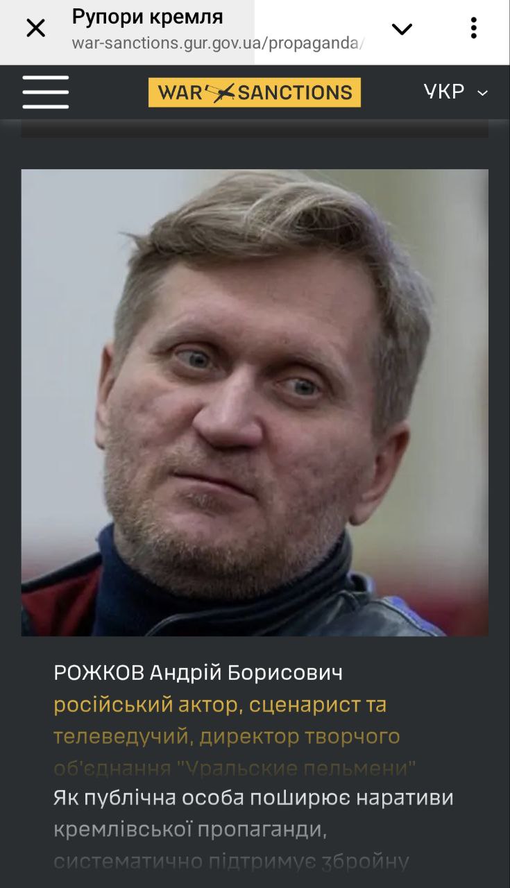 Рожков Андрєй Борісовіч – російський сценарист та телеведучий, директор творчого об’єднання “уральскіє пєльмєні”, член руху “putin Team” та довірена особа путіна на президентських виборах 2018 року, який активно долучається до заходів на підтримку російських окупаційних військ.