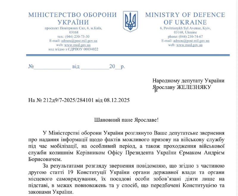 Він оприлюднив відповідь МОУ на свій депутатський запит від 8 січня 2026 року. У документі зазначено, що Єрмак Андрій Борисович станом на момент розгляду запиту не реєструвався в жодному територіальному центрі комплектування та соціальної підтримки з наміром проходити військову службу під час мобілізації або за контрактом.