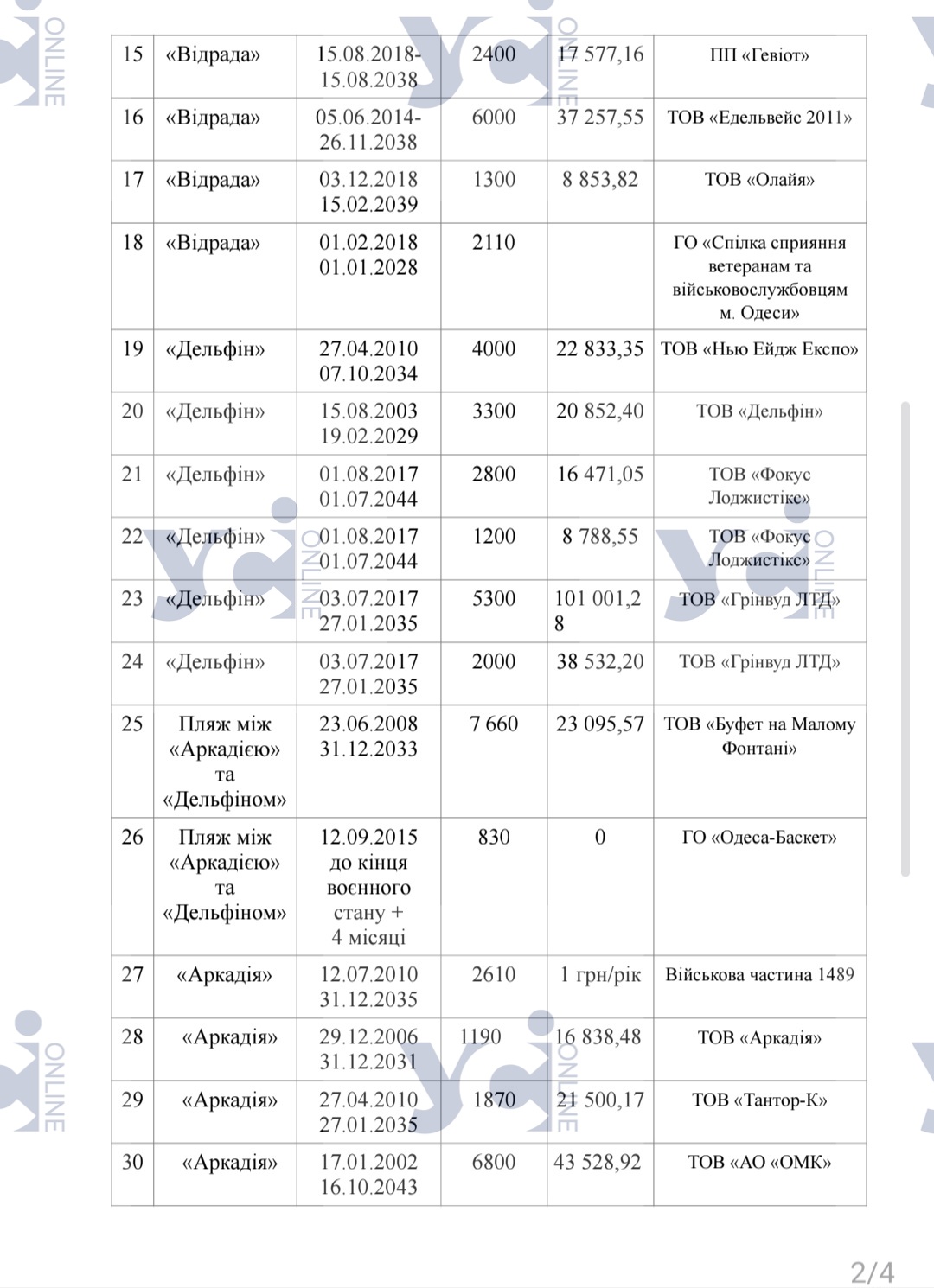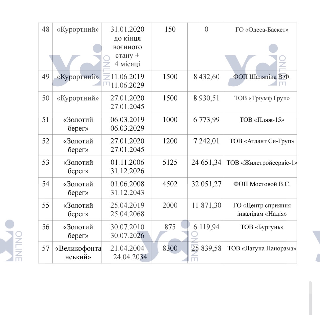 Схожа історія й з ТОВ «Грінвуд ЛТД». Компанія орендує дві ділянки пляжу Дельфін під однойменним житловим комплексом на Французькому бульварі, але сумарно до бюджету міста чомусь сплачує найбільшу вартість: за лютий майже 140 тисяч гривень (площа 7300 кв.м).