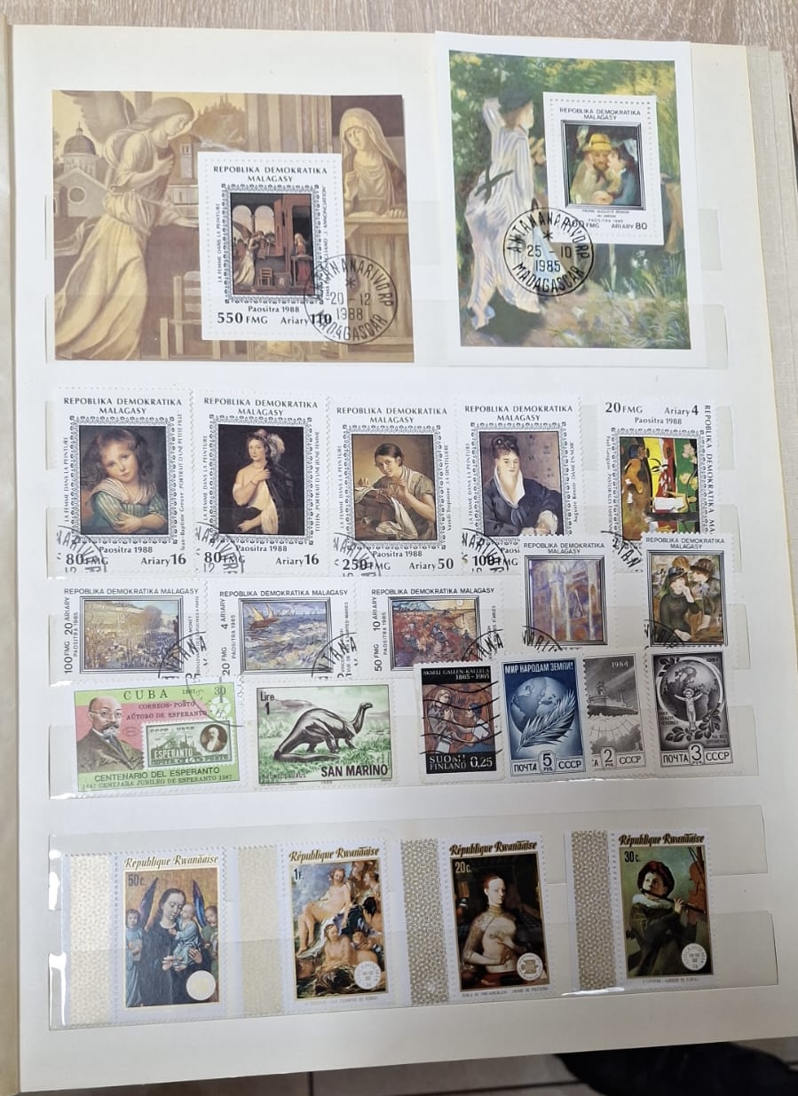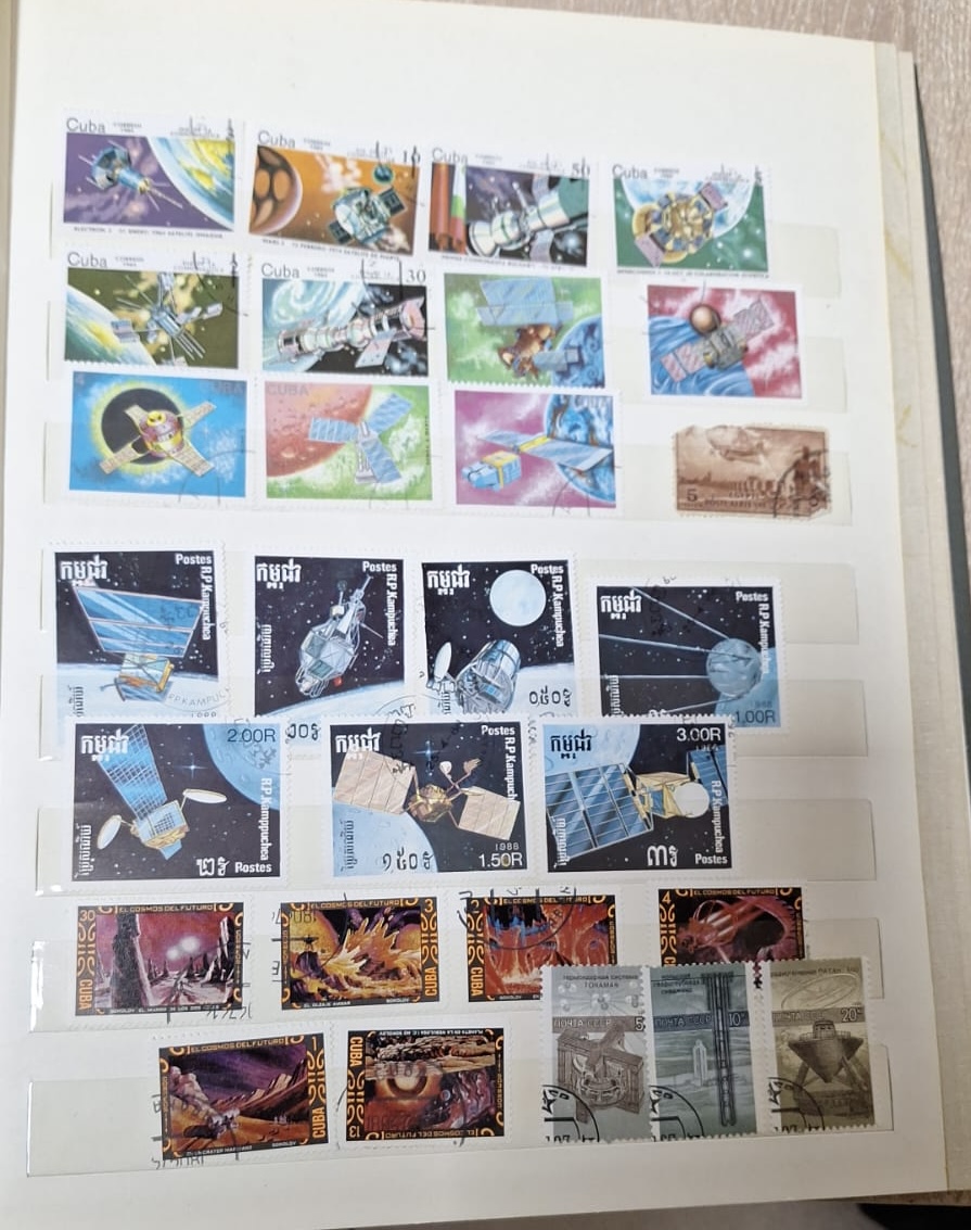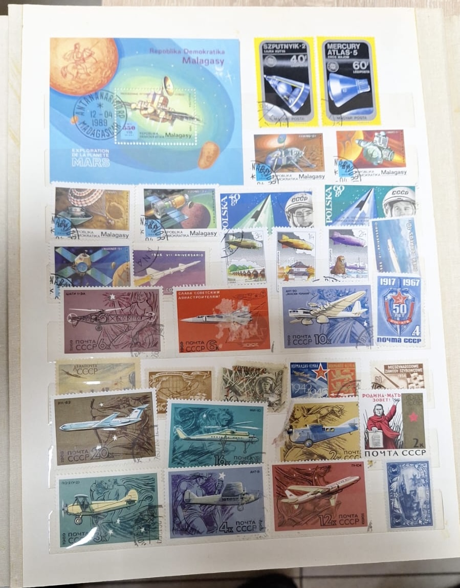 Марки датуються 1908–1980 роками. Серед них пам’ятні випуски, присвячені темі дослідження космосу, а також марки Куби, Мадагаскару, Монголії, Чехословаччини, Болгарії, Румунії, Буркіна-Фасо та інших країн.