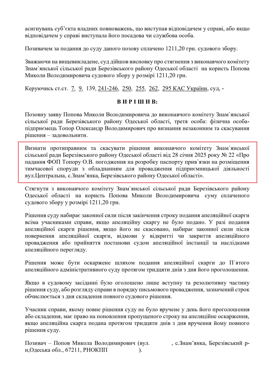 Одеський окружний адміністративний суд рішенням від 29 січня 2026 року задовольнив позов жителя c. Знам'янка Березівського району Миколи Попова та скасував скандальне рішення виконавчого комітету Знам'янської сільської ради щодо встановлення тимчасової споруди в центрі Знам' янки.