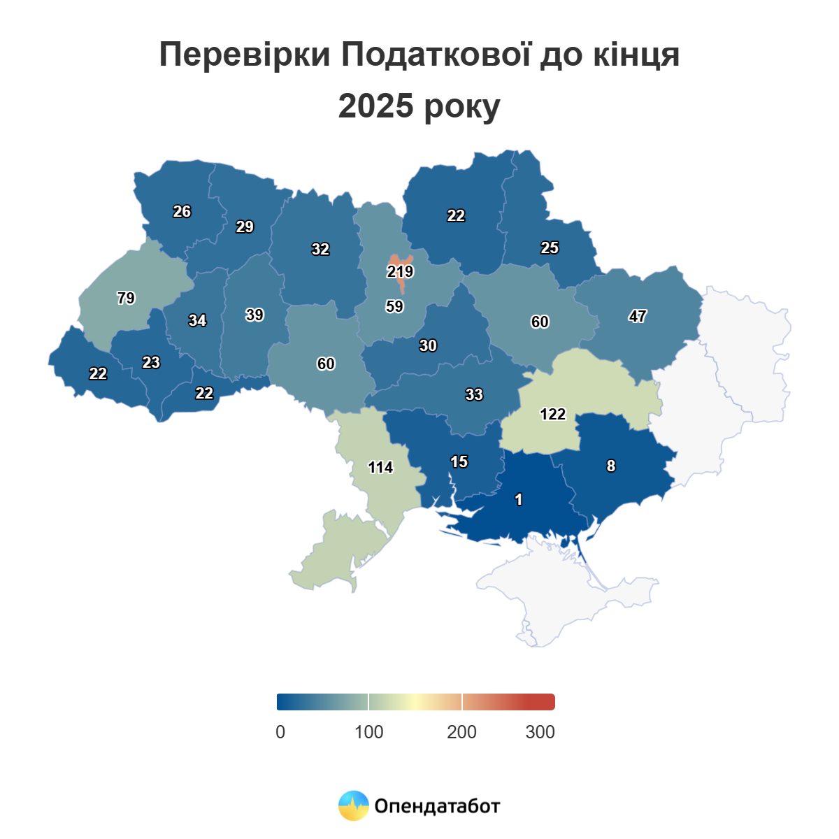 Кожна п’ята перевірка відбудеться у столиці — 219, наслідують податківці з Дніпропетровщини (122 або 11%), Одещини (114 або 10%), Львівщини (79 або 7%) та Полтавщини (60 або 5,4%).