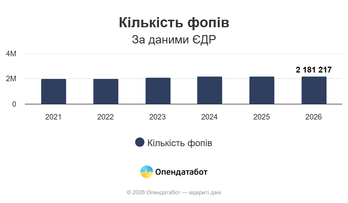 Згідно з оновленими даними, в Україні наразі зареєстровано 2 181 217 фізичних осіб-підприємців (ФОП) – на близько 6 000 більше, ніж на кінець 2025 року.
