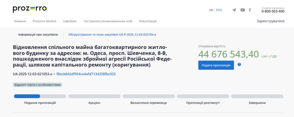 Кінцевий строк подання тендерних пропозицій – 17 грудня 2025 року. Як раніше повідомляли в одеській мерії, завершення усіх ремонтних робіт на локації заплановано до кінця 2025 року.