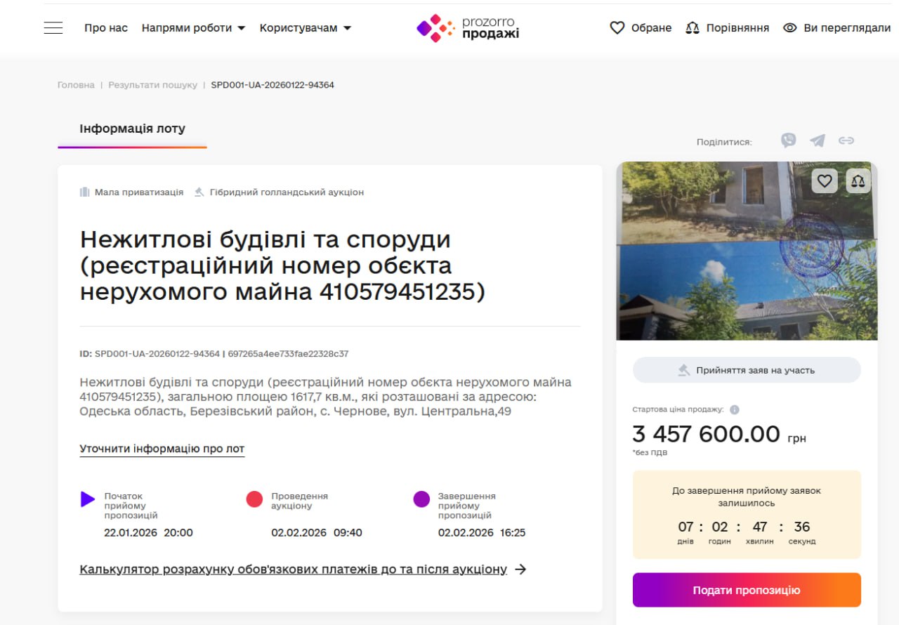 На цей раз будівлю та споруди продають за 3 457 600 гривень. Аукціон має відбутися 2 лютого.