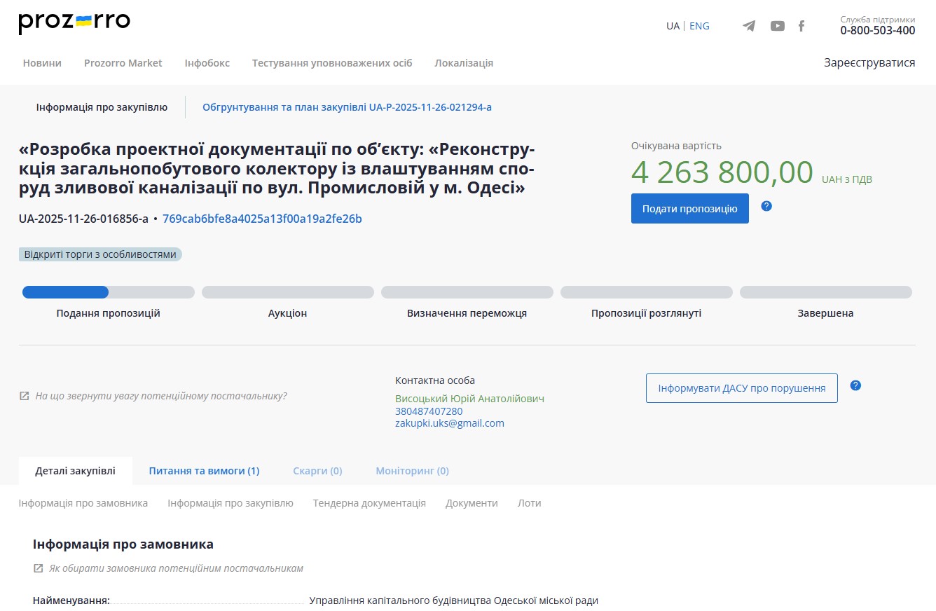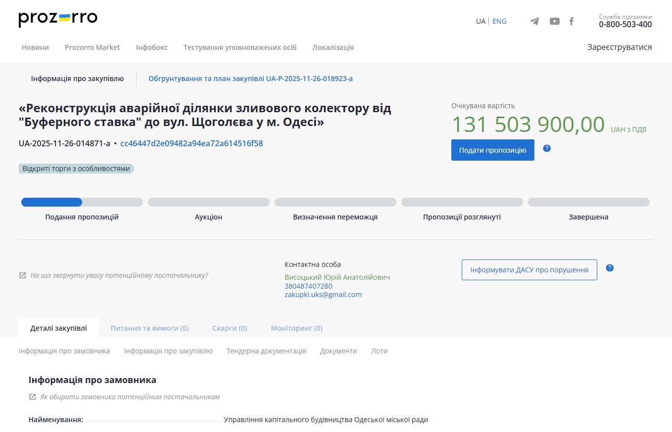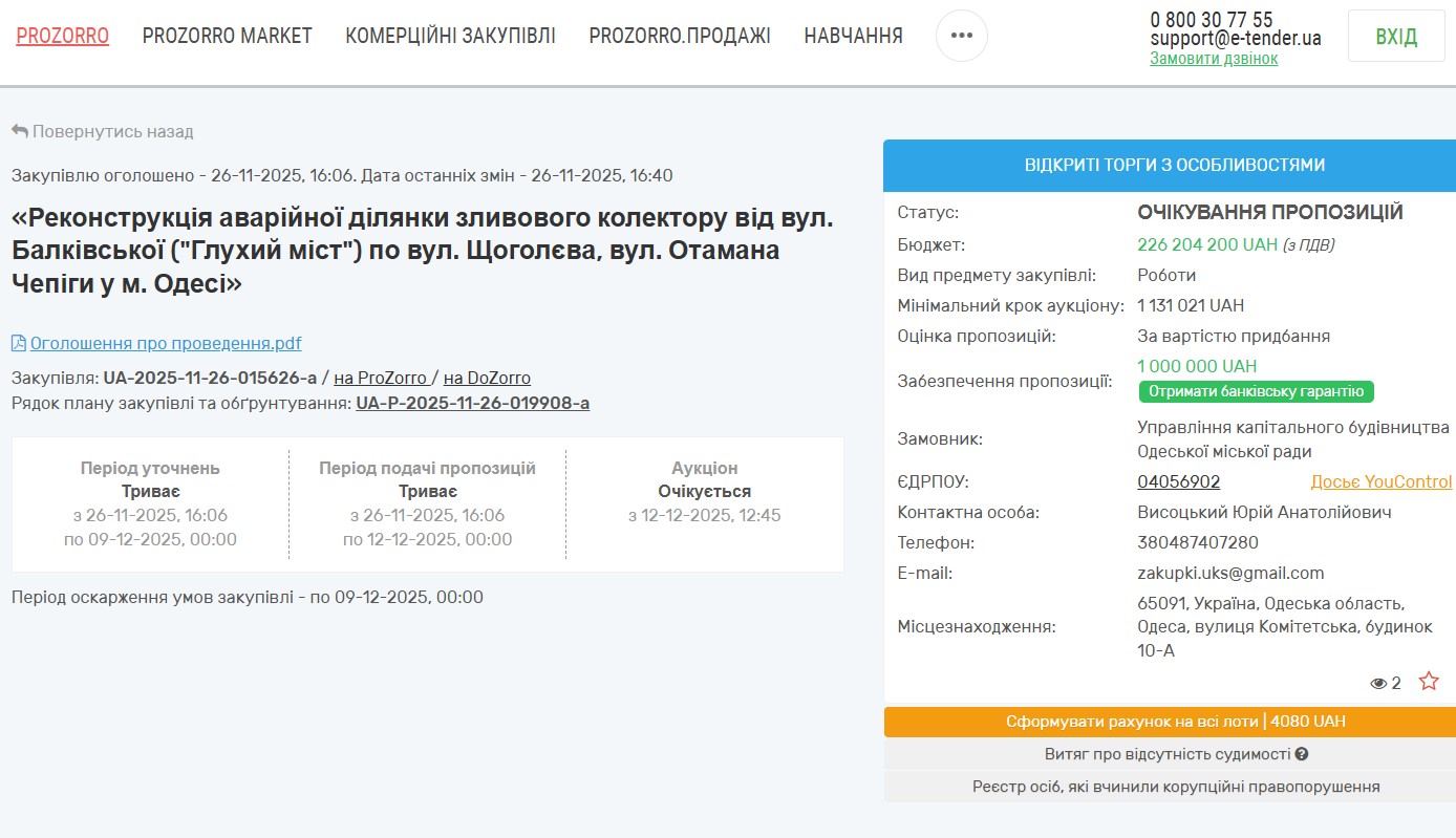 Управління капітального будівництва Одеської міської ради 26 листопада 2025 року виставило на торги перший лот – реконструкцію відрізку колектора між «Буферним ставком» та вулиці Щоголєва.