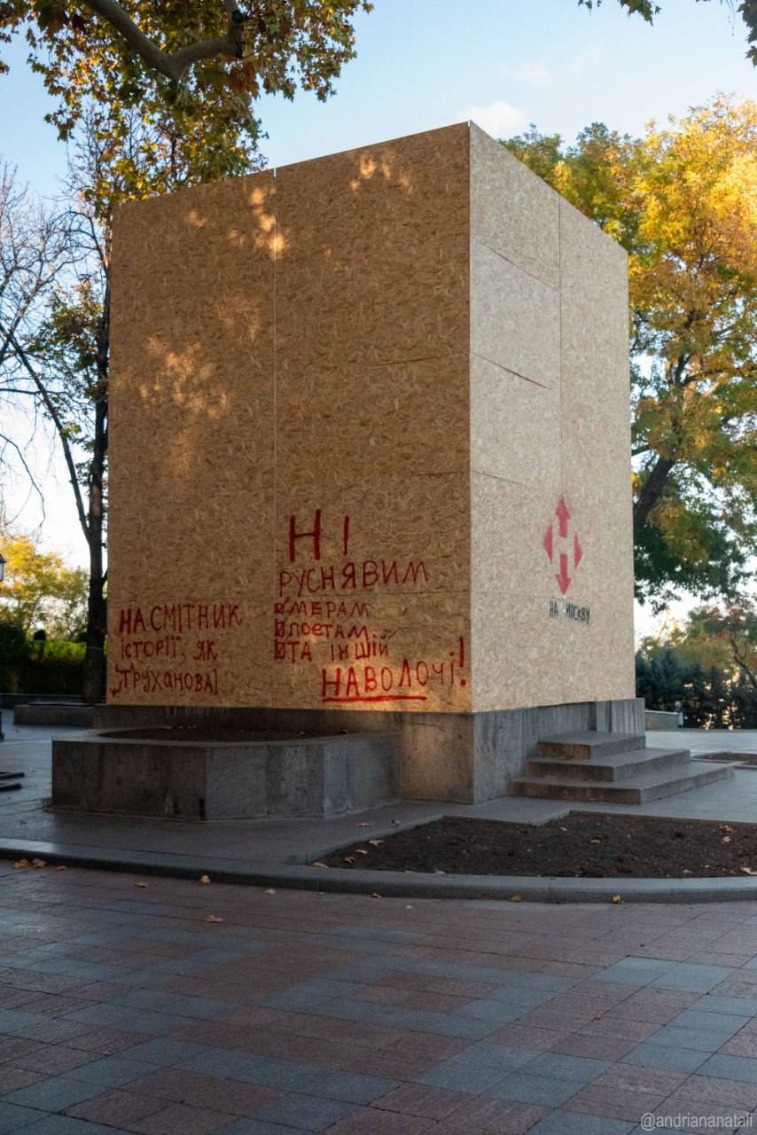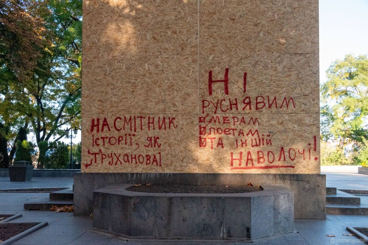 На дошках, які закрили пам’ятник Пушкіну від огляду містяни вже залишили низку надписів: «На смітник історії, як Труханова», «На Москву», а також «Ні руснявим мерам, поетам та іншій наволочі».