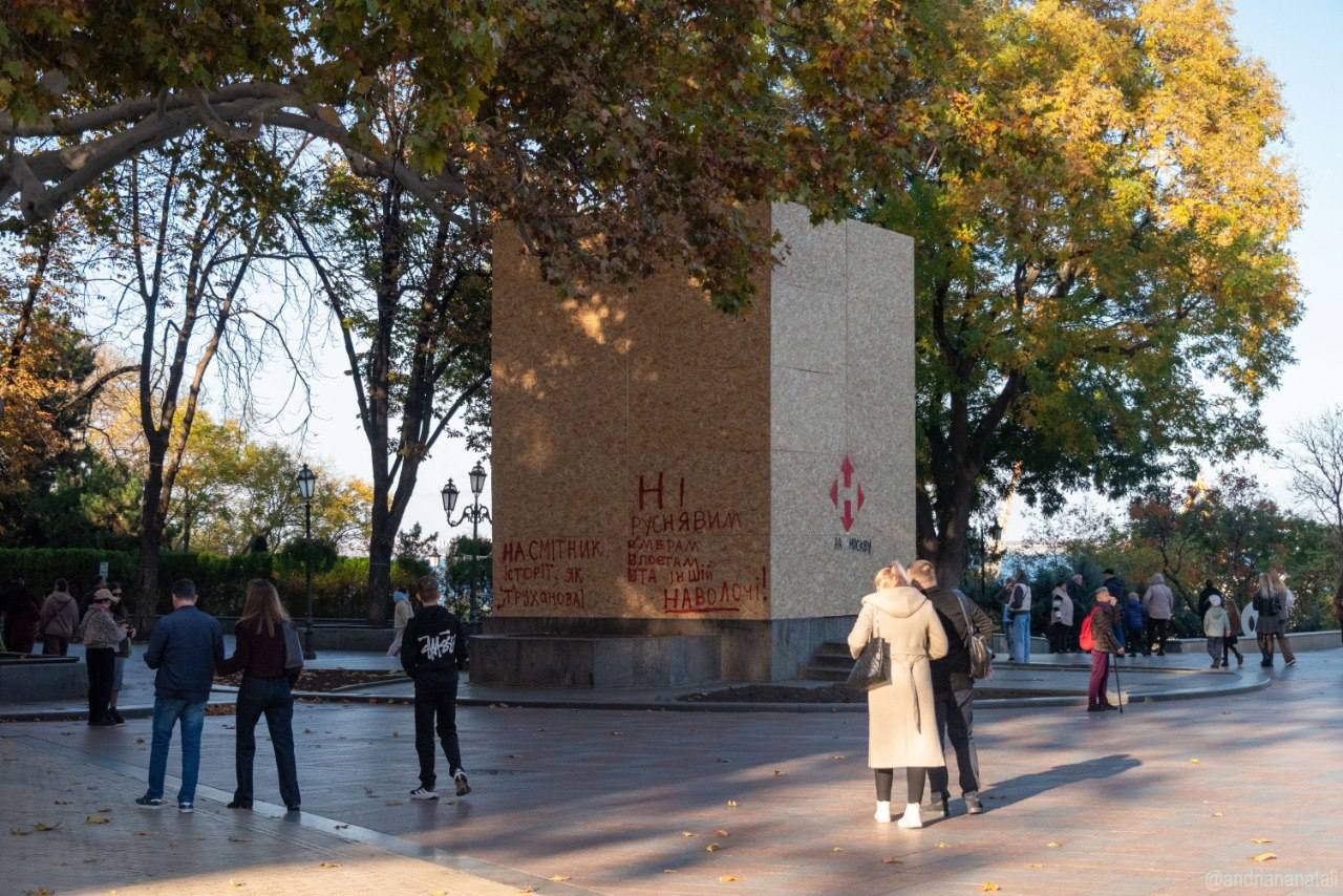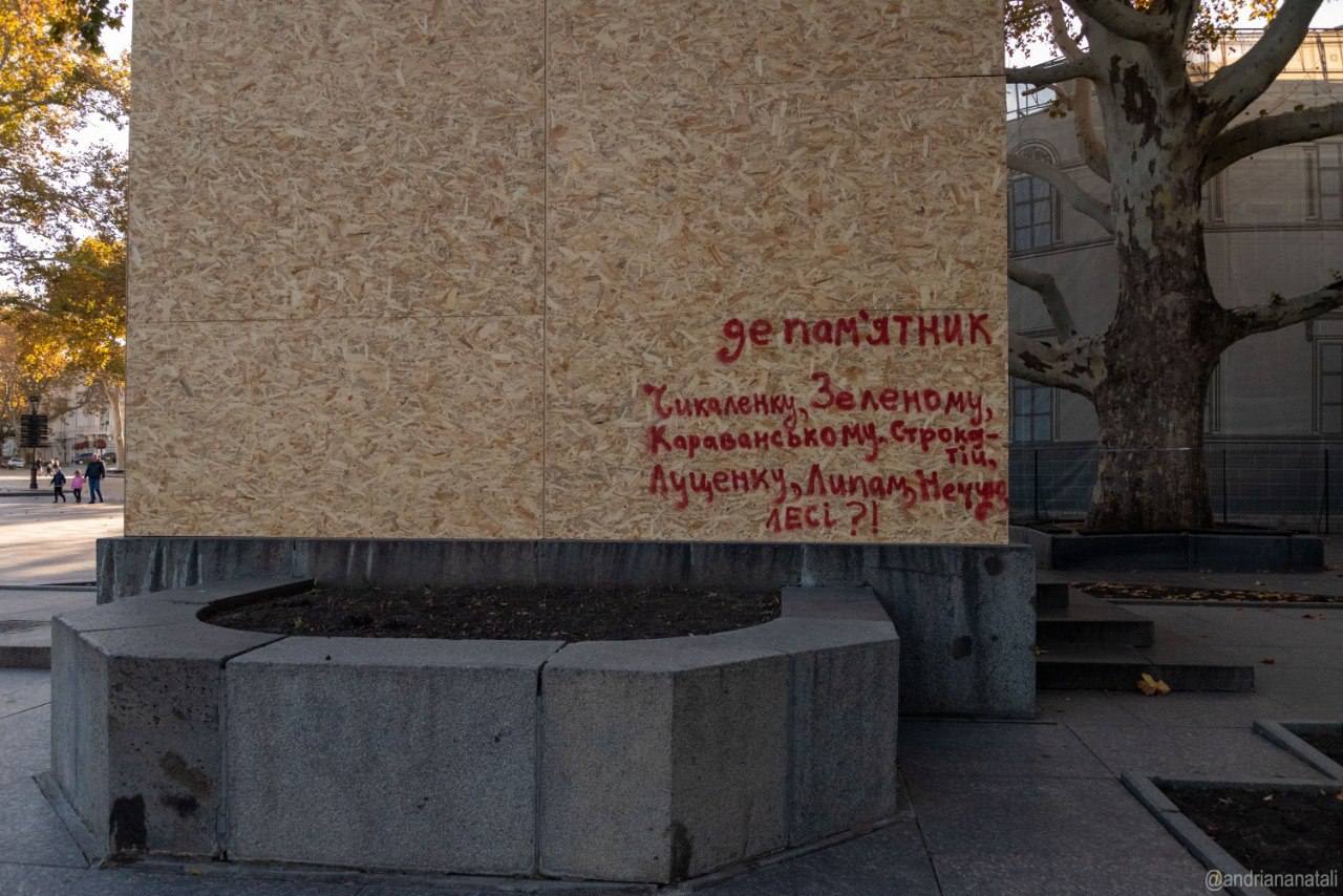 На Біржовій площі, де нещодавно прибрали від очей громадськості пам'ятник Пушкіну, закривши його OSB-дошками, - одесити активно залишають свої написи.