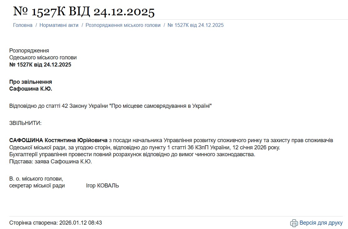 В Одесі звільнили начальника Управління розвитку споживчого ринку та захисту прав споживачів — Костянтина Сафошина. Він залишив посаду за угодою сторін 12 січня 2026 року.