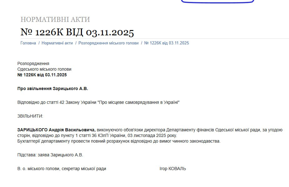 Причиною кадрового рішення могла стати невдала поява чиновника на апаратній нараді – Зарицький не зміг відповісти на запитання голови військової адміністрації Сергія Лисака щодо бюджету-2026 і був фактично виведений із зали.