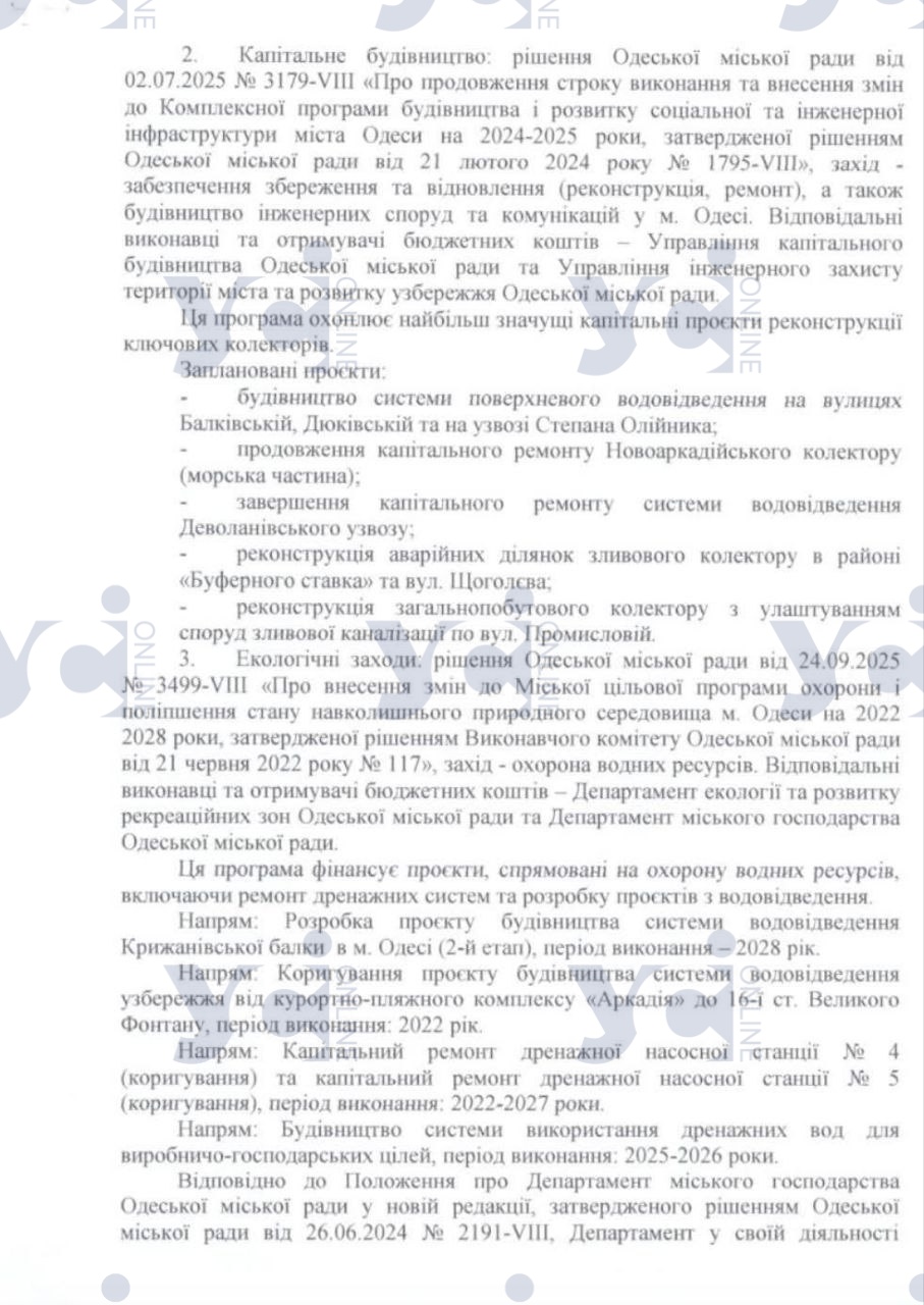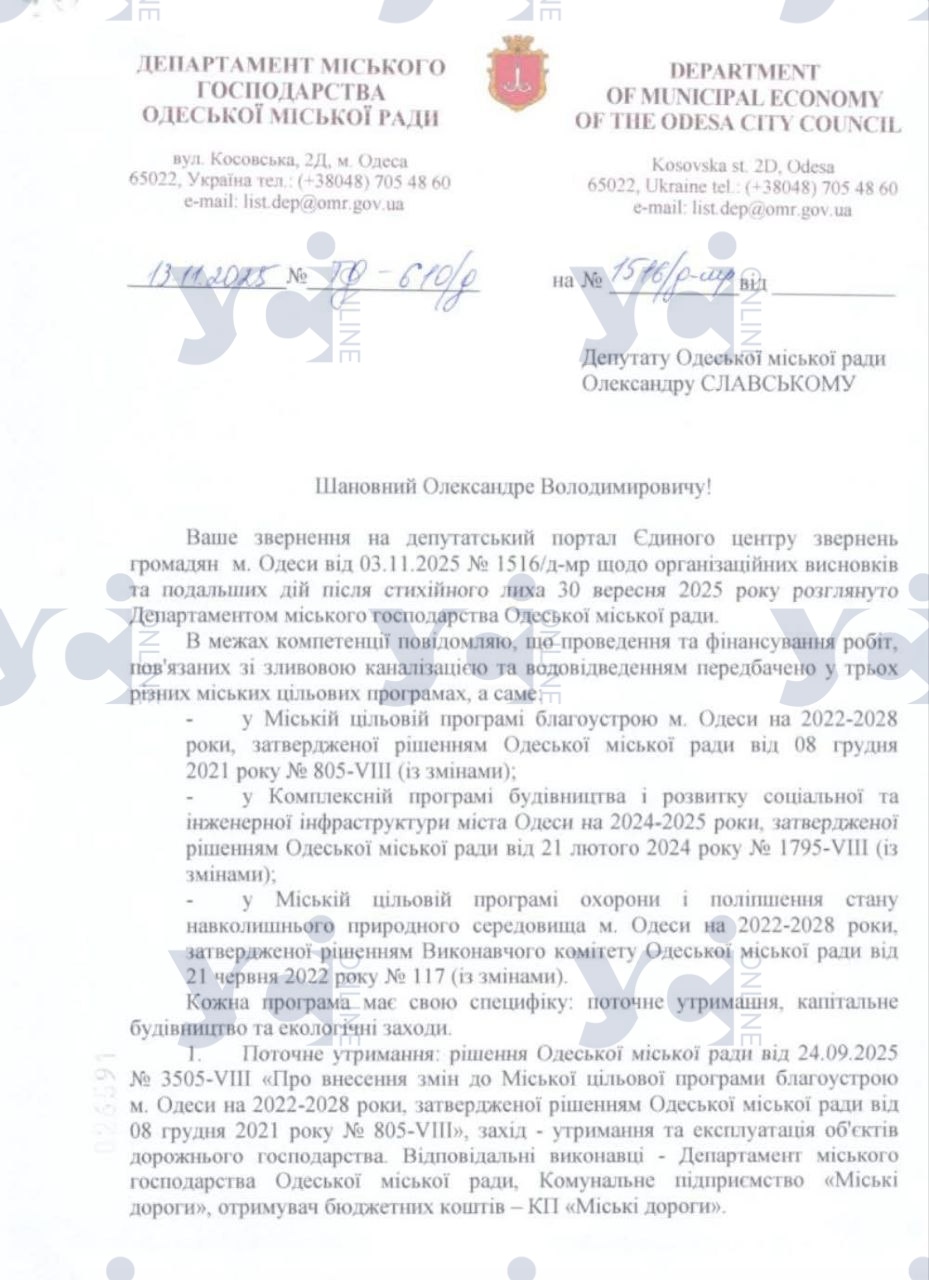 У Департаменті міського господарства послалися на низку проєктів, запроваджених у межах різних міських цільових програм, але додали, що «відповідно до рішення Виконавчого комітету Одеської міської ради від 04.04.2012 № 157 єдиним замовником з проєктування, будівництва, реконструкції, капітального ремонту об’єктів комунальної власності нежитлового фонду та інженерних мереж м. Одеси (тепло-, водо-, газо-, електропостачання, госпфекальної і зливової каналізації та споруд, розташованих на них) визначено Управління капітального будівництва Одеської міської ради».