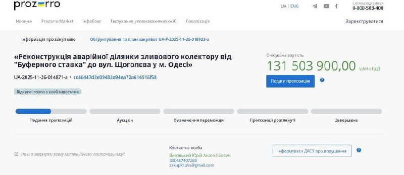 Днями на сайті державних закупівель відбулися три тендери на загальну суму понад 360 млн гривень. Відновити планують дві аварійні ділянки зливового колектора — від Балківської («Глухий міст») до вулиць Щоголєва та Отамана Чепіги, а також від «Буферного ставка» до Щоголєва. Ще один, третій тендер, спрямований на розробку проєктної документації для реконструкції загальнопобутового колектора з улаштуванням споруд зливової каналізації на вулиці Промисловій.