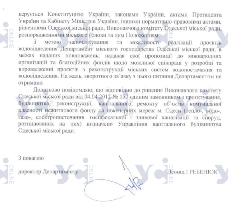 У Департаменті міського господарства послалися на низку проєктів, запроваджених у межах різних міських цільових програм, але додали, що «відповідно до рішення Виконавчого комітету Одеської міської ради від 04.04.2012 № 157 єдиним замовником з проєктування, будівництва, реконструкції, капітального ремонту об’єктів комунальної власності нежитлового фонду та інженерних мереж м. Одеси (тепло-, водо-, газо-, електропостачання, госпфекальної і зливової каналізації та споруд, розташованих на них) визначено Управління капітального будівництва Одеської міської ради».
