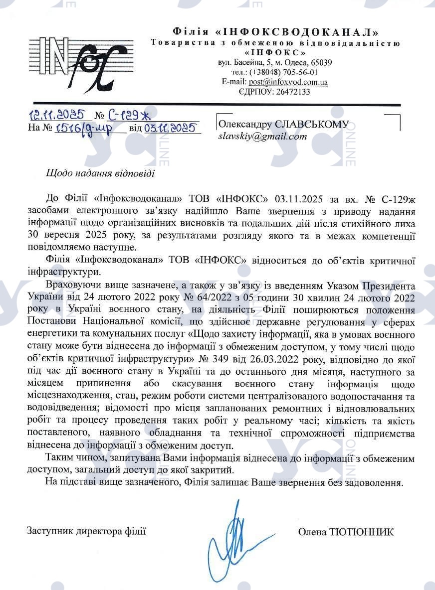 У ТОВ «ІНФОКС» взагалі повідомили, що філія «Інфоксводоканал» належить до об’єктів критичної інфраструктури. Через це, а також через дію воєнного стану в Україні, вони не можуть надати запитувану інформацію.