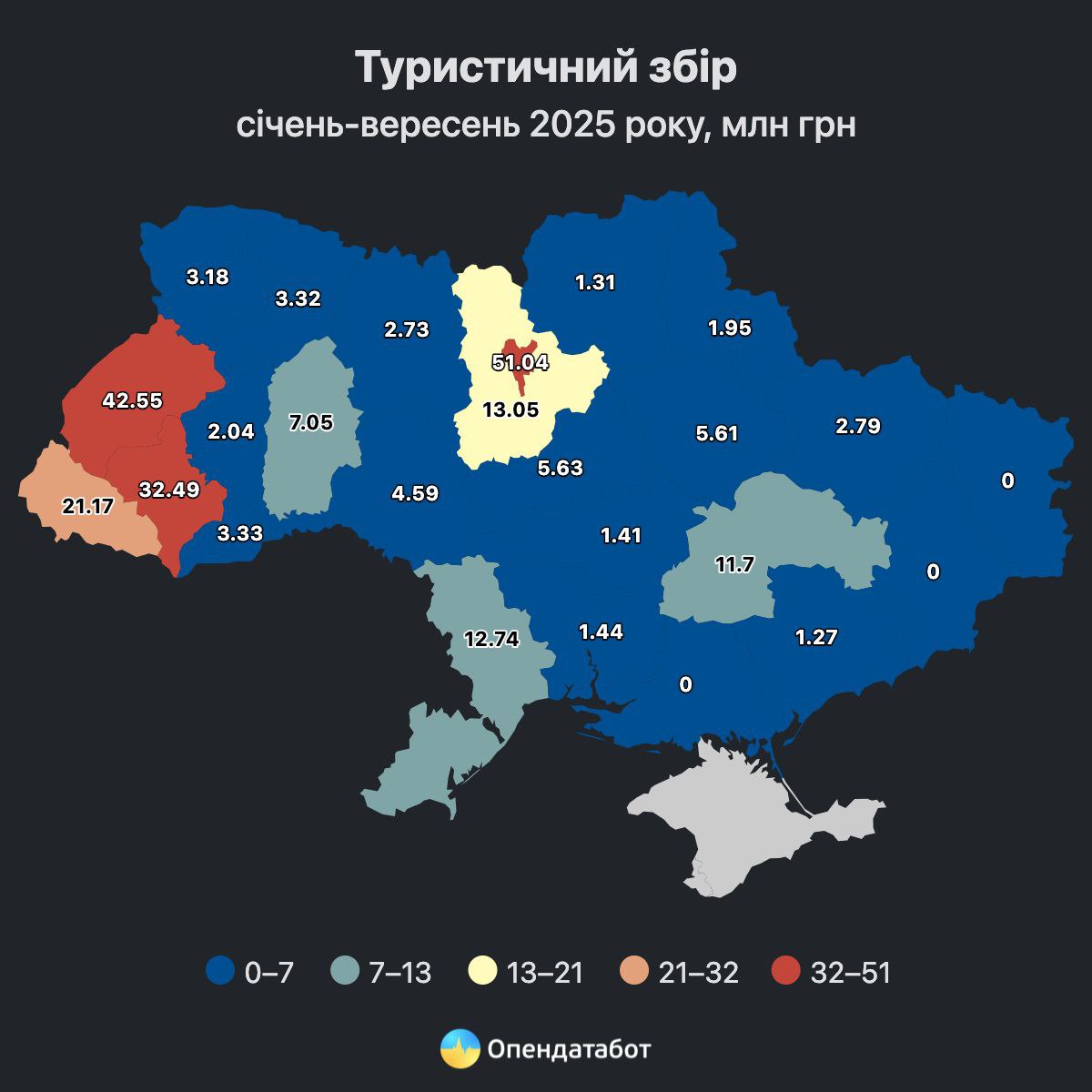 Загалом майже 92 млн гривень туристичного збору надійшло у місцеві бюджети з липня по вересень
