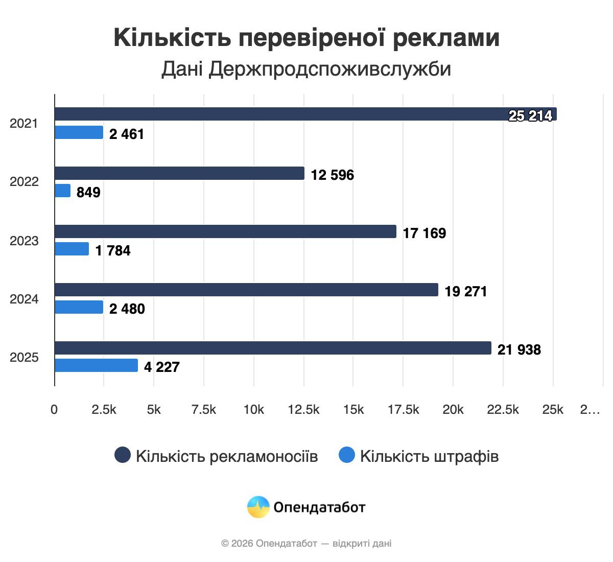 Майже 22 тисячі перевірок носіїв реклами в Україні провела Держпродспоживслужба у 2025 році. Понад половина перевірок торік стосувалась зовнішньої реклами. Водночас Держпродспоживслужба стала активніше перевіряти й промо у соцмережах та на сайтах.