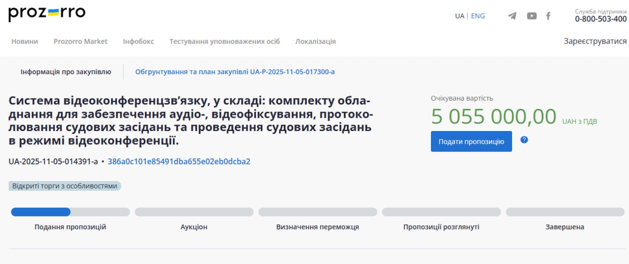 Кінцевий термін подання пропозицій 10 листопада. Сума закупівлі 5 055 000 гривень. За ці гроші суд планує придбати один системний блок, з процесорами не менш ніж 8 ядер, монітор та блок безперебійного живлення, HDMI спліттер – обладнання, завданням якого є передача відео та аудіо сигналів на двох і більше споживачів одночасно, пристрій апаратно-програмного квадрування зображення, акустичні колонки та навушники.