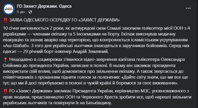 Десятого січня виповнилося два роки з моменту захоплення гелікоптера місії ООН у Сомалі. На його борту перебували чотири громадянина України та п'ятеро іноземців. В тому числі й бортінженер, 29-річний одесит Андрій Земляний.