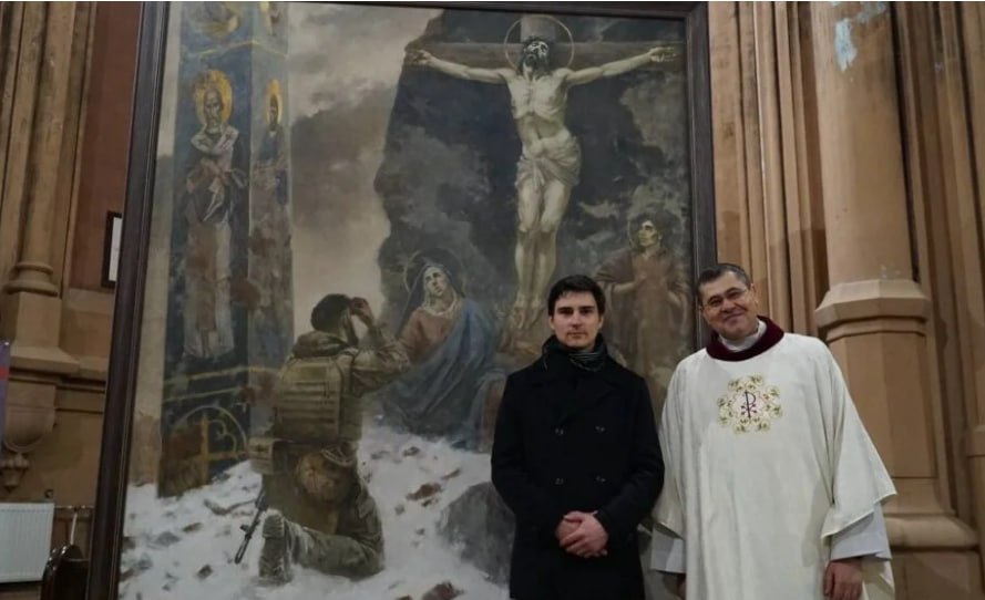 Коли молодий український художник Іван Волошин серед зими в холодній майстерні біля храму святого Миколая в Києві писав картину «Молитва», він виклав на полотні те, що сьогодні переживає Україна. Перед розп’яттям, зображеним на стіні храму, знищеного бомбардуванням, приклонивши коліно, воїн робить хресне знамення. Поруч, на вцілілій колоні, образ святителя Миколая, покровителя київського римо-католицького храму, біля якого постала картина.