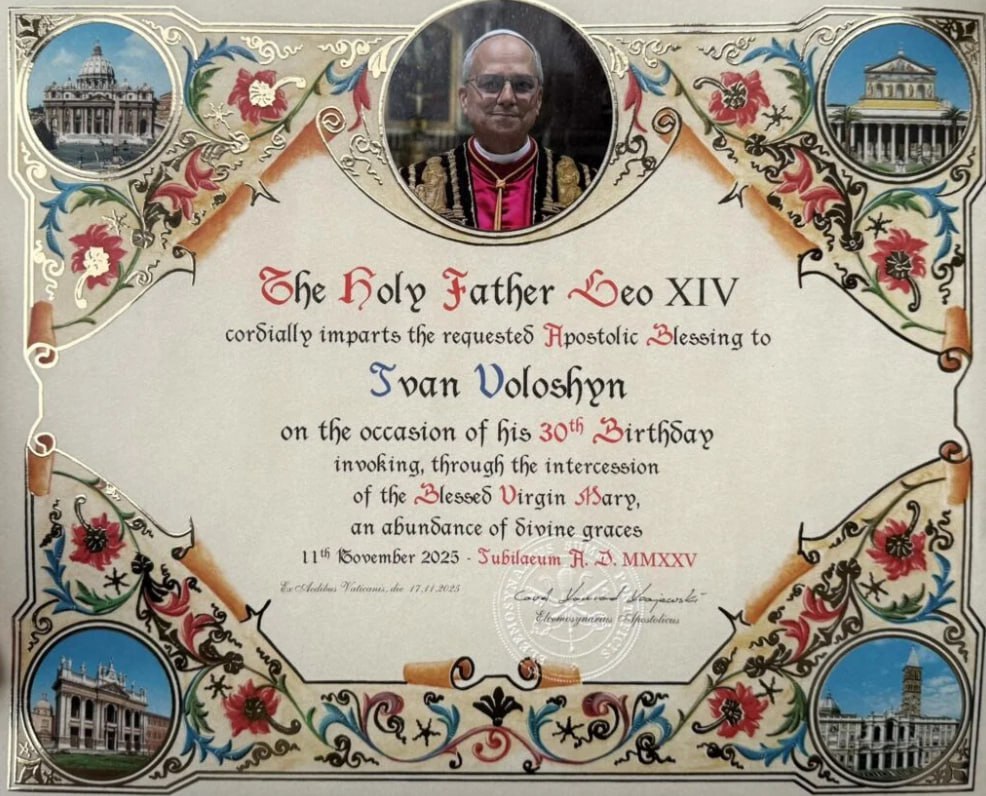 Під час паломництва до Ватикану настоятель Римсько-католицької парафії святого Миколая у Києві отець Павло Вишковський презентував Папі Римському картину молодого талановитого художника з Білгорода-Дністровського Івана Волошина, яка має назву «Молитва». Лев XIV не лише прийняв цінний подарунок з України, а й відзначив молодого художника буллою.
