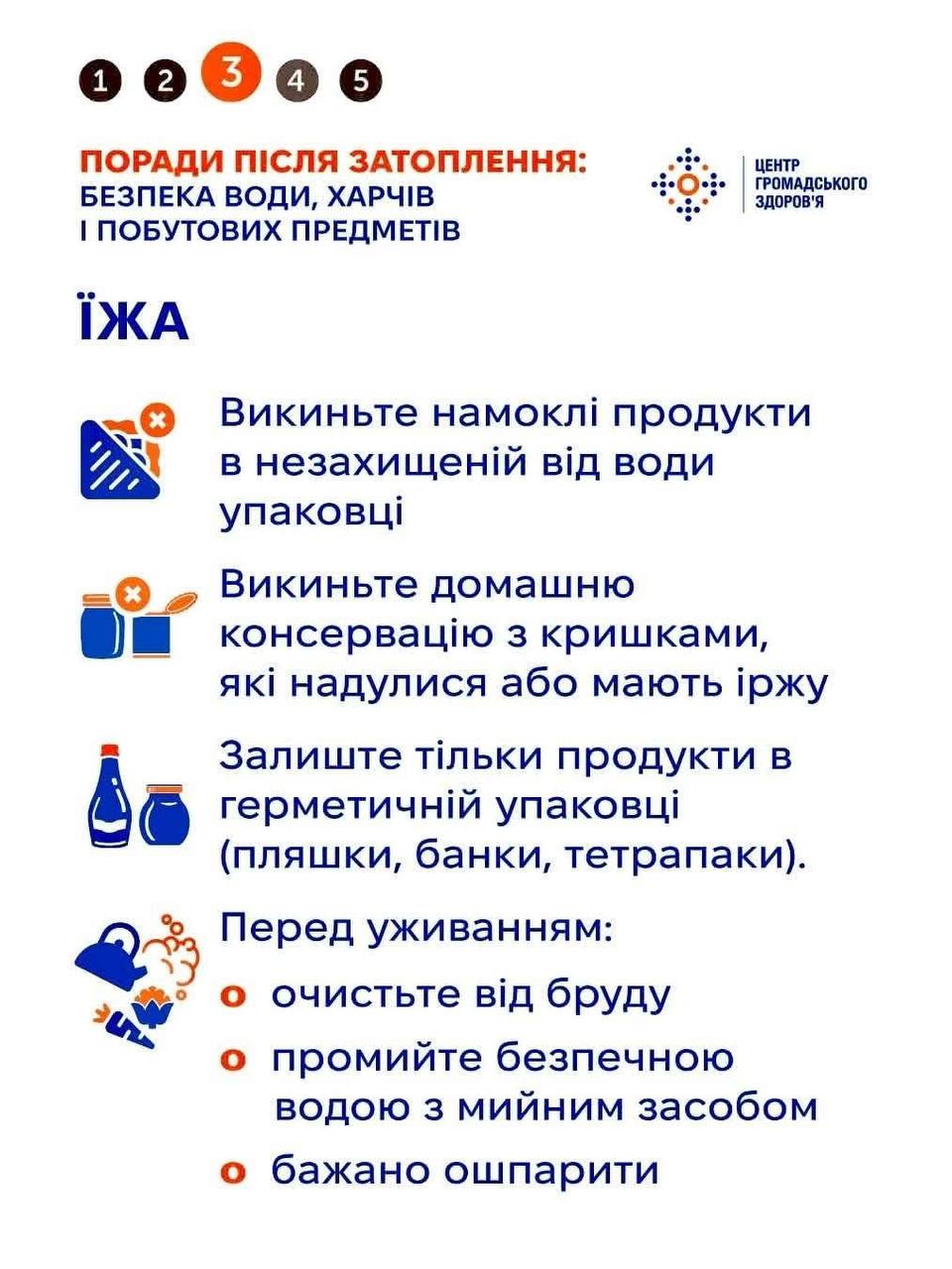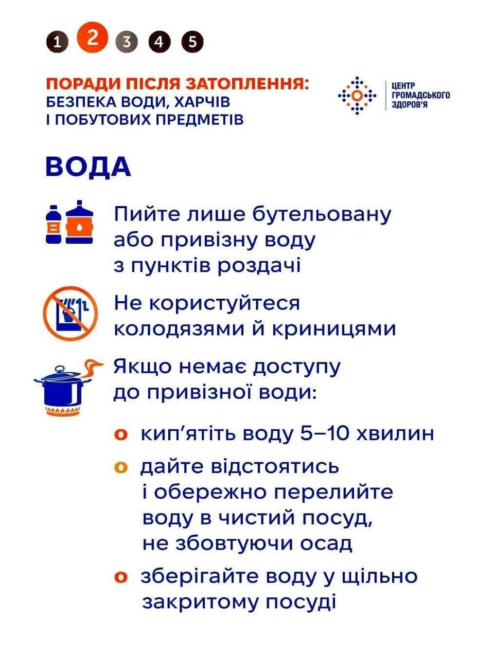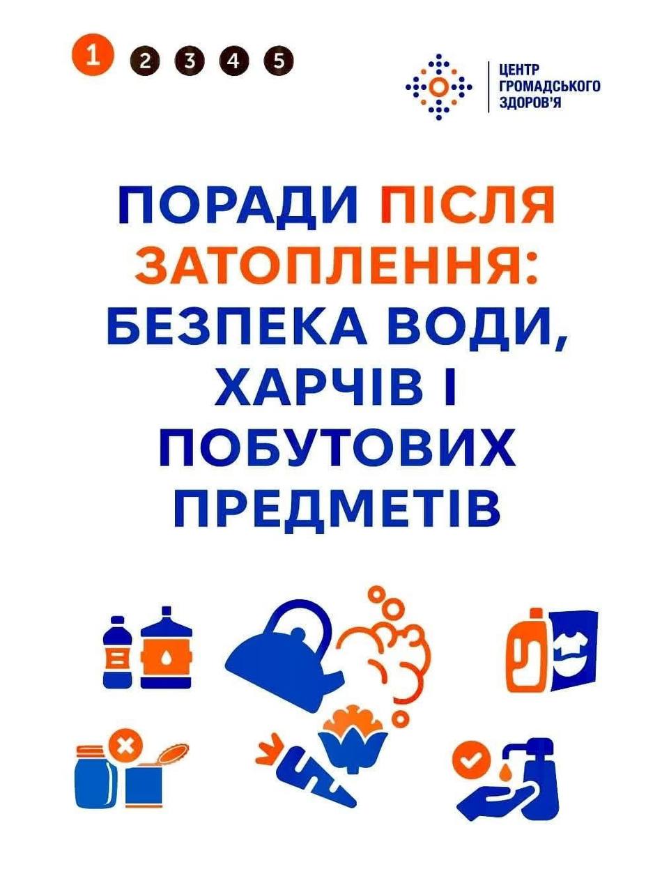 Спеціалісти закликали перевіряти воду перед використанням, не вживати продуктів, що контактували з підтопленою землею чи водою, а також обробляти руки та поверхні дезінфекційними засобами.