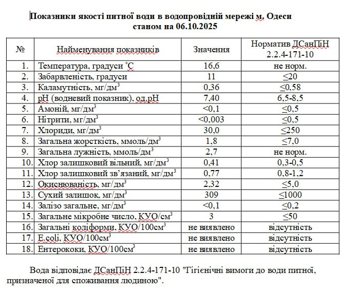 Перед тим як потрапити до домівок, вода проходить кілька етапів очищення та знезараження на сучасному європейському обладнанні, розповіли фахівці. Якість контролюють цілодобово — за понад п’ятьма десятками показників. Паралельний контроль проводить також Одеський обласний центр контролю та профілактики хвороб.
