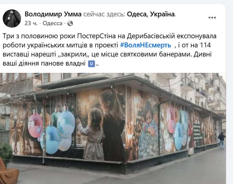 Три з половиною роки ПостерСтіна на Дерибасівській експонувала роботи українських митців в проекті #ВоляНЕсмерть , і от на 114 виставці нарешті “закрили” це місце святковими банерами. Дивні ваші діяння панове владні, – зазначив Володимир Уманенко.