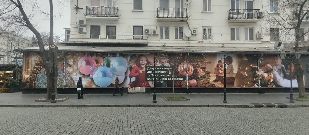 Плакати одеських митців про спротив під час війни на Дерибасівській закрили святковим банером з рекламою (фото)