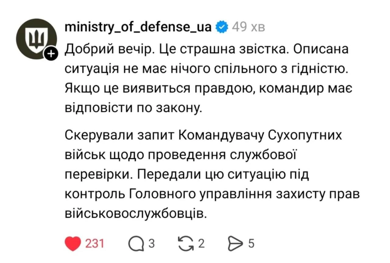 Пізніше, ввечері 26 лютого, на розголос трагедії у соцмережах, відреагувало Міністерство оборони.