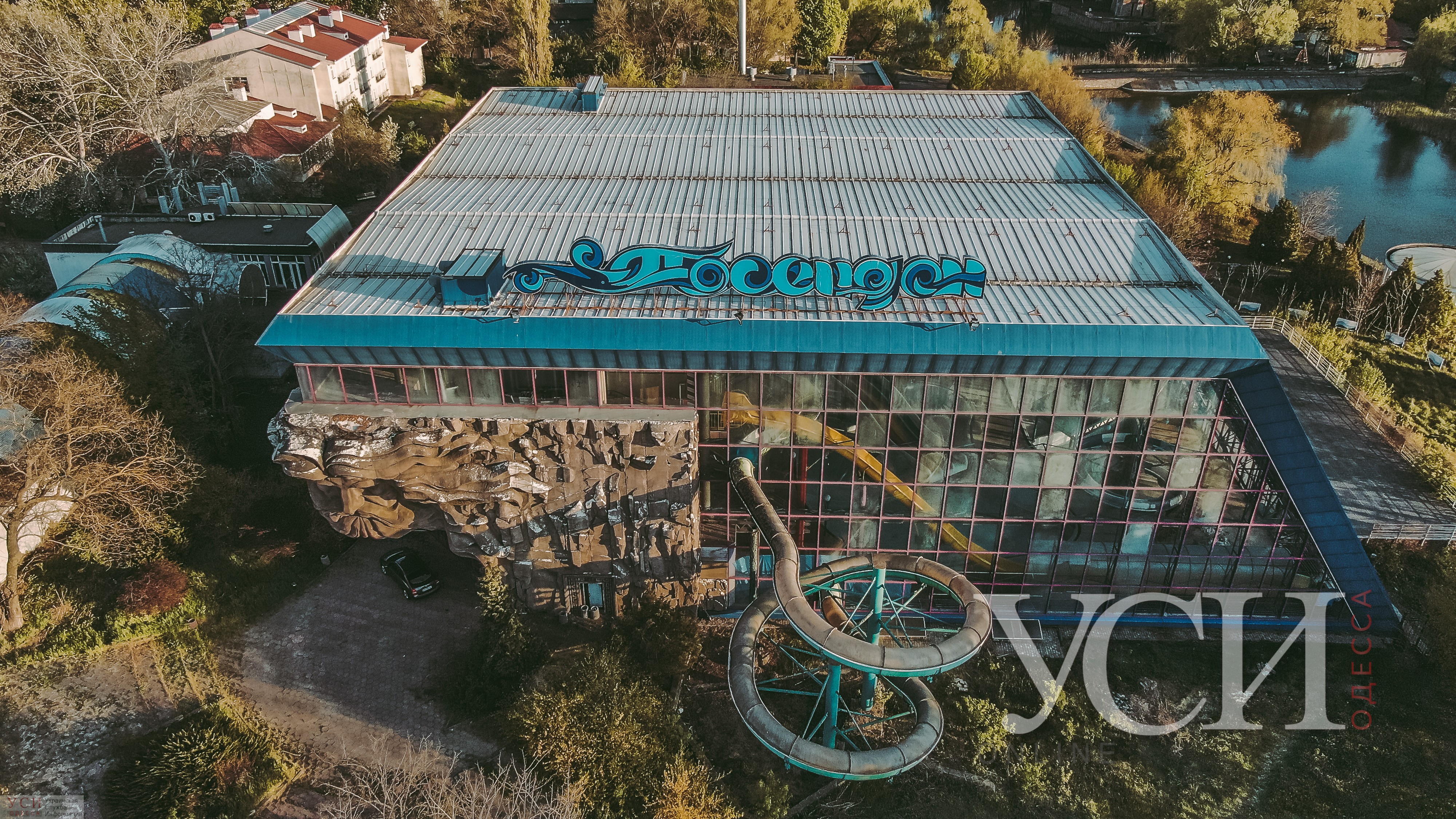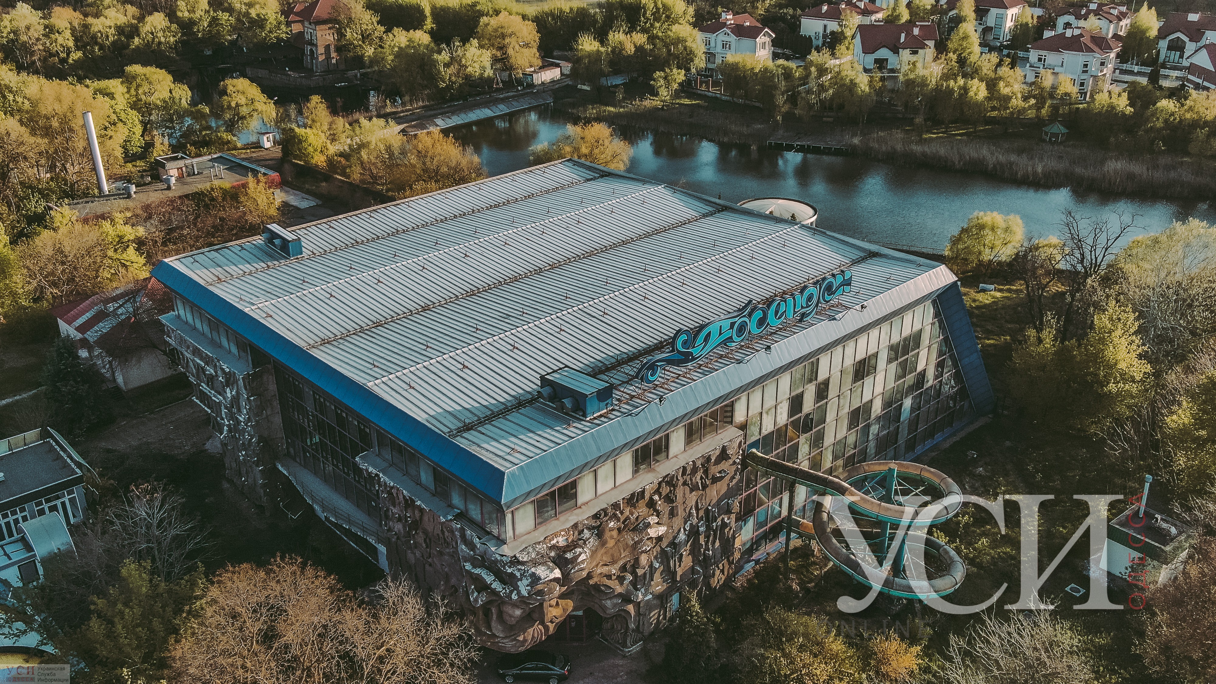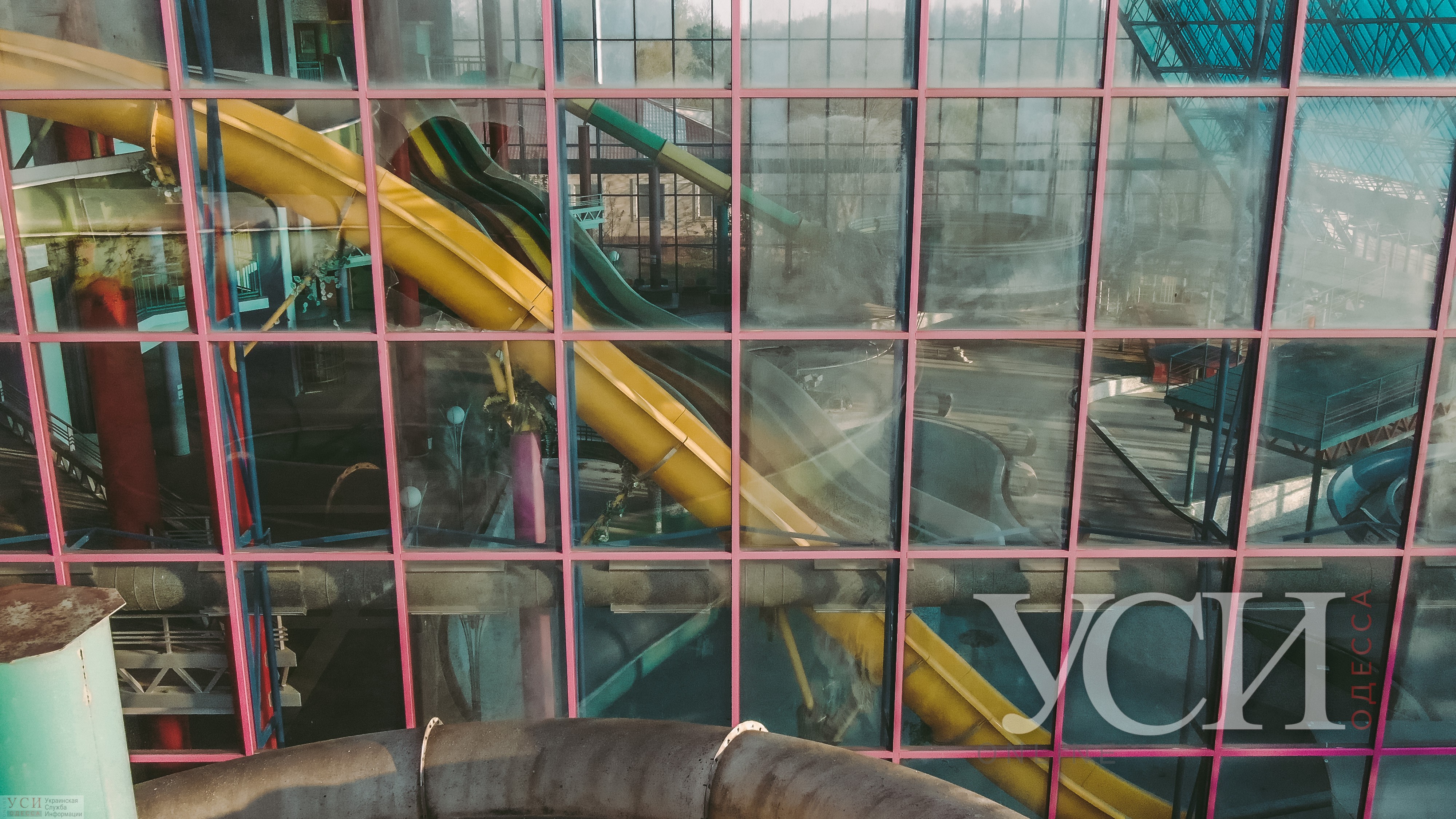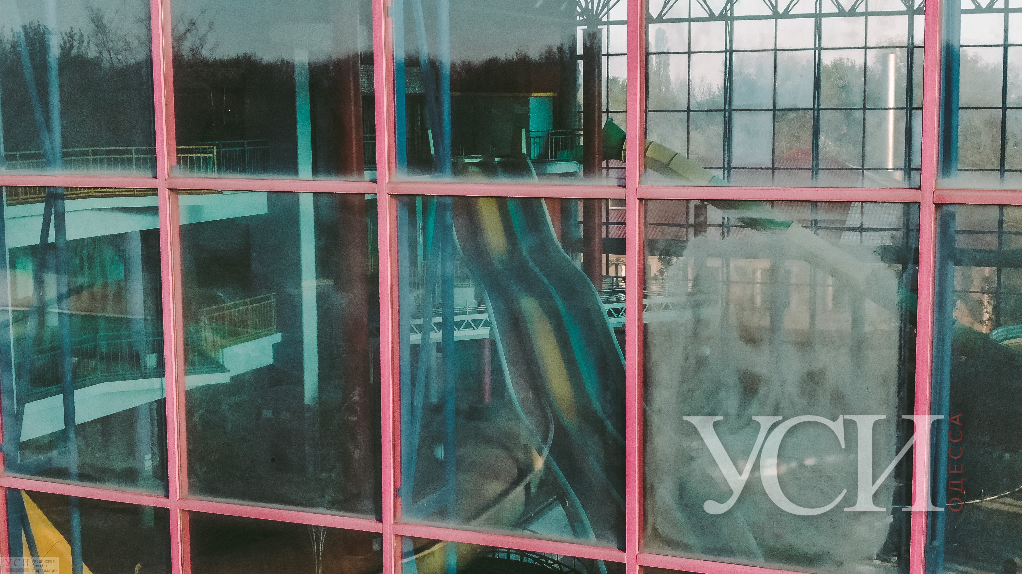 Огромный барельеф на фасаде самого здания побелел, некоторые стекла потрескались и опали, а часть водных горок, которая находится на улице, покрылась вьющимися растениями. Впрочем, если заглянуть в окна, можно увидеть, что внутри убрано, а оборудование и аттракционы на месте. Дело в том, что здание аквапарка находится под постоянной охраной сотрудников Одесского порта, на балансе которого оно и находится.