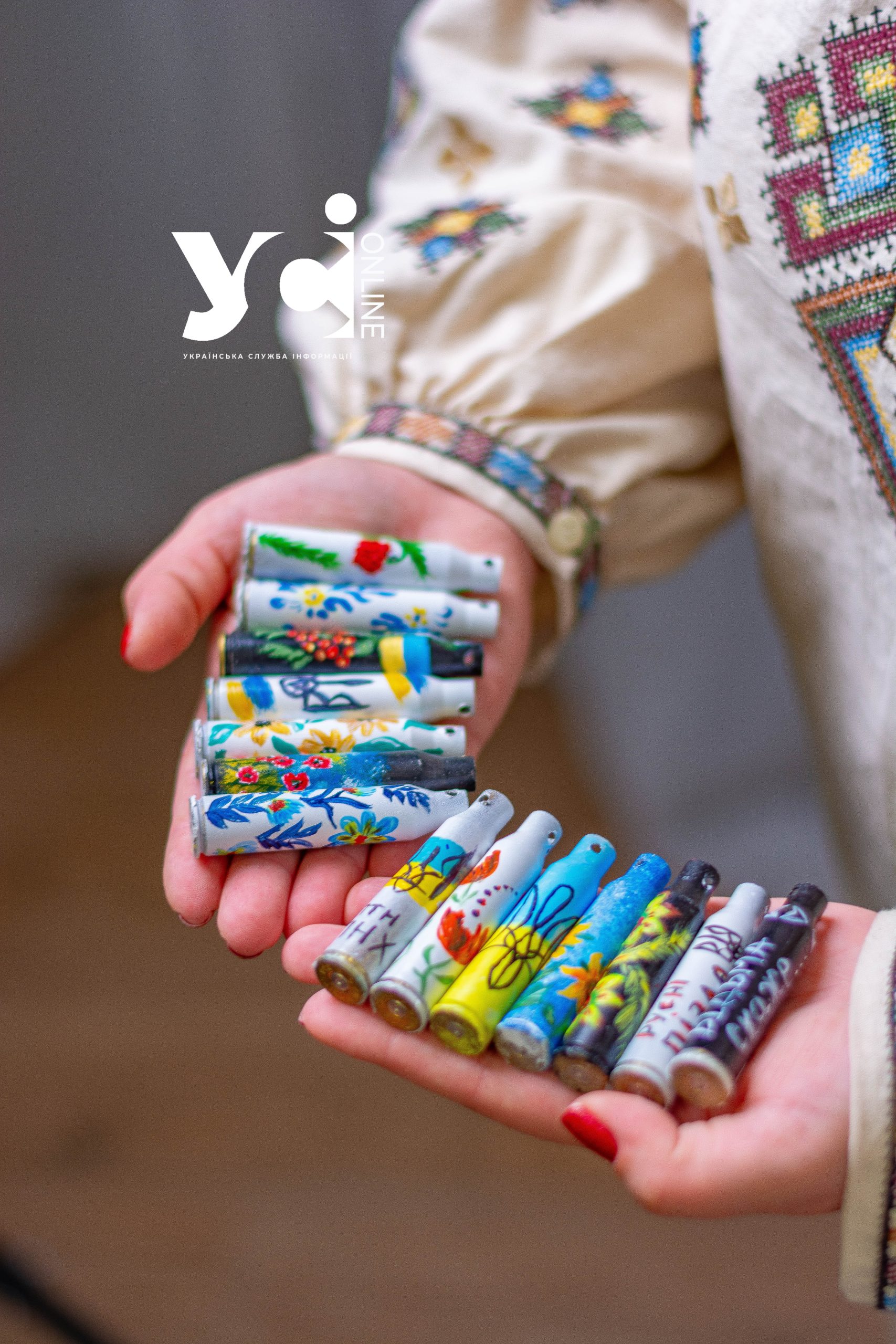 Свою частину історії кожній гільзі додають волонтери. Так, одну з них розмалювала дівчина, що двічі тікала від війни: спочатку з Донецька, а згодом – з Одеси. У своєму малюнку вона зобразила Оперний театр, стілець з Міського саду та якір.