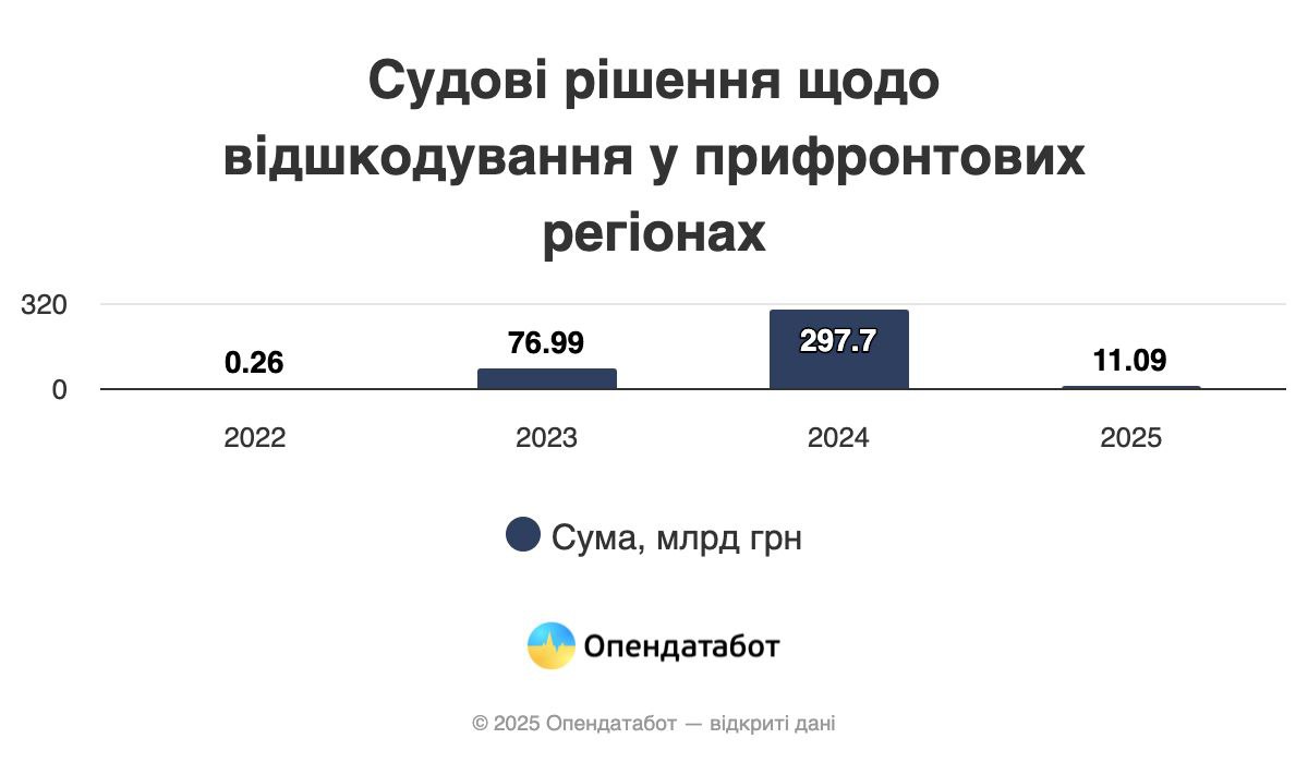 Разом із кількістю зростають і суми вимог. Так, у перший рік повномасштабної війни бізнесу присудили компенсувати лише 260 млн гривень, а вже у 2023-му сума рішень зросла до майже 77 млрд грн. Абсолютний пік припав на 2024 рік — понад 297 млрд гривень. Цьогоріч сума рішень знизилась до 11 млрд гривень.