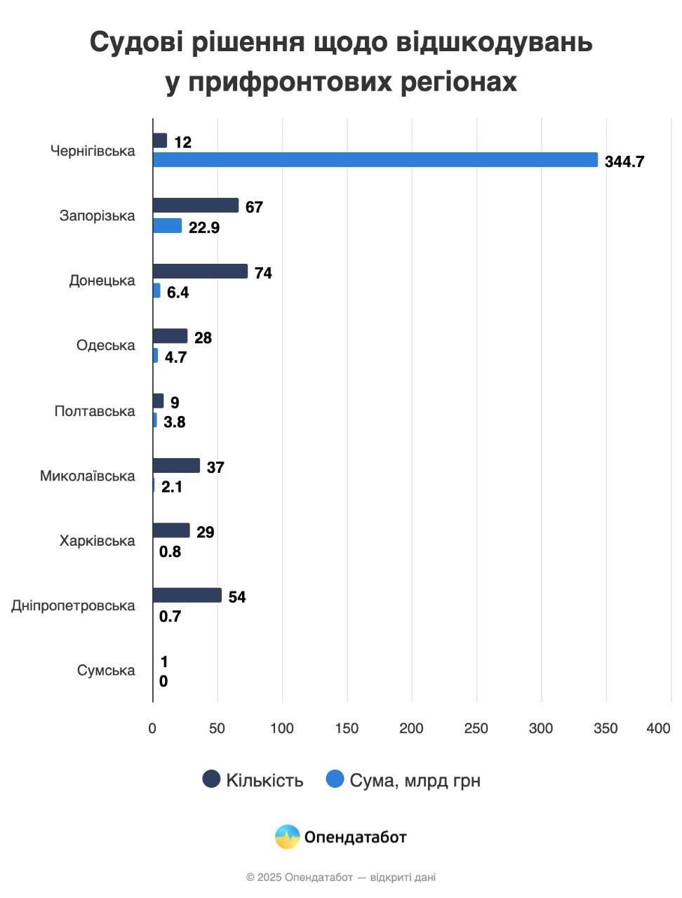 Тож Чернігівщина із 344,7 млрд грн очолила рейтинг регіонів за загальною сумою задоволених позовів, значно випередивши інші області. Для порівняння, у Запорізькій області загальна сума стягнень становить 22,9 млрд грн, у Донецькій — 6,36 млрд, в Одеській — 4,68 млрд.