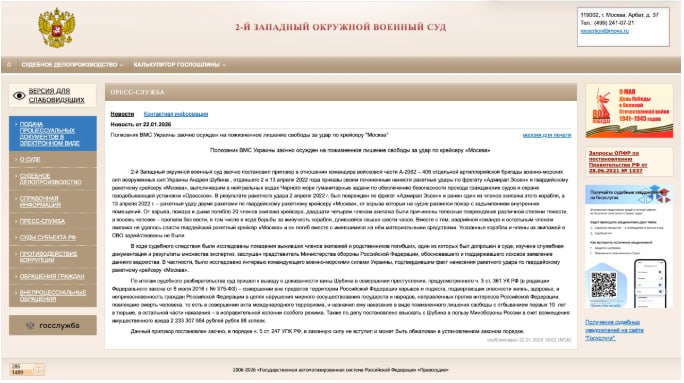 Окружний військовий суд Москви, виніс вирок у справі про затоплення крейсера «Москва» та фрегата «Адмирал Эссен» командиру артилерійської бригади ВМС України та заочно засудив його до довічного ув'язнення за статтею про міжнародний тероризм. Також в рішенні вказувалося про кількість загиблих, зниклих безвісті та поранених на судні. Незабаром після виходу пресрелізу його видалили з сайту суду, але копія залишилася у «Медіазони».