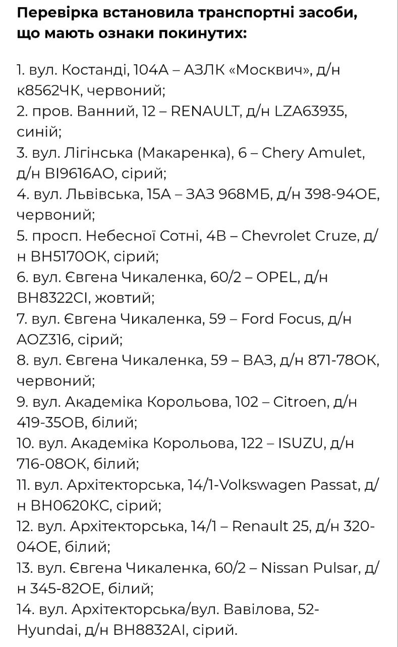 Але, як зауважив депутат, усі ці автівки мають номерні знаки, тому встановити їхніх власників цілком реально. Коли людину знайдуть, їй надішлють лист із пропозицією підтвердити право власності або пояснити, що вона планує робити з авто. Додатково міськрада публікує списки покинутих авто на сайті та в офіційному телеграм-каналі, щоб власники самі зверталися в департамент.