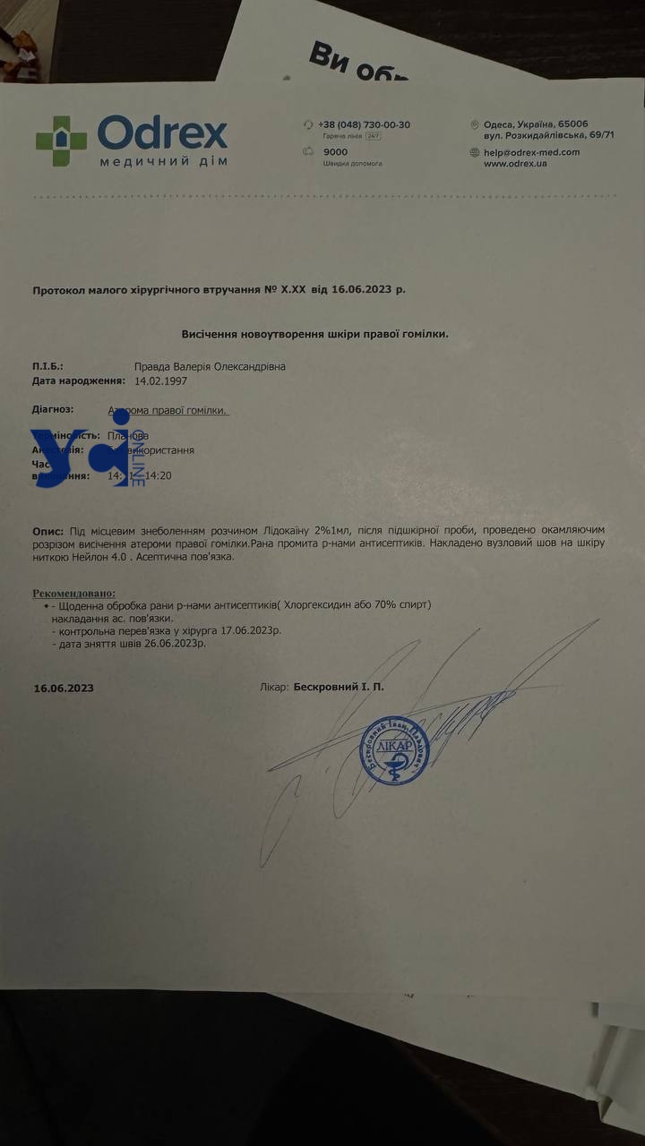 Одеситка Валерія Правда звернулася до клініки з новоутворенням, але після операції виявилося, що воно не було повністю видалене. Лікарі спочатку запевняли її, що все добре, а після звернення з претензіями клініка не тільки не принесла вибачень, а й почала погрожувати юридичними наслідками.
