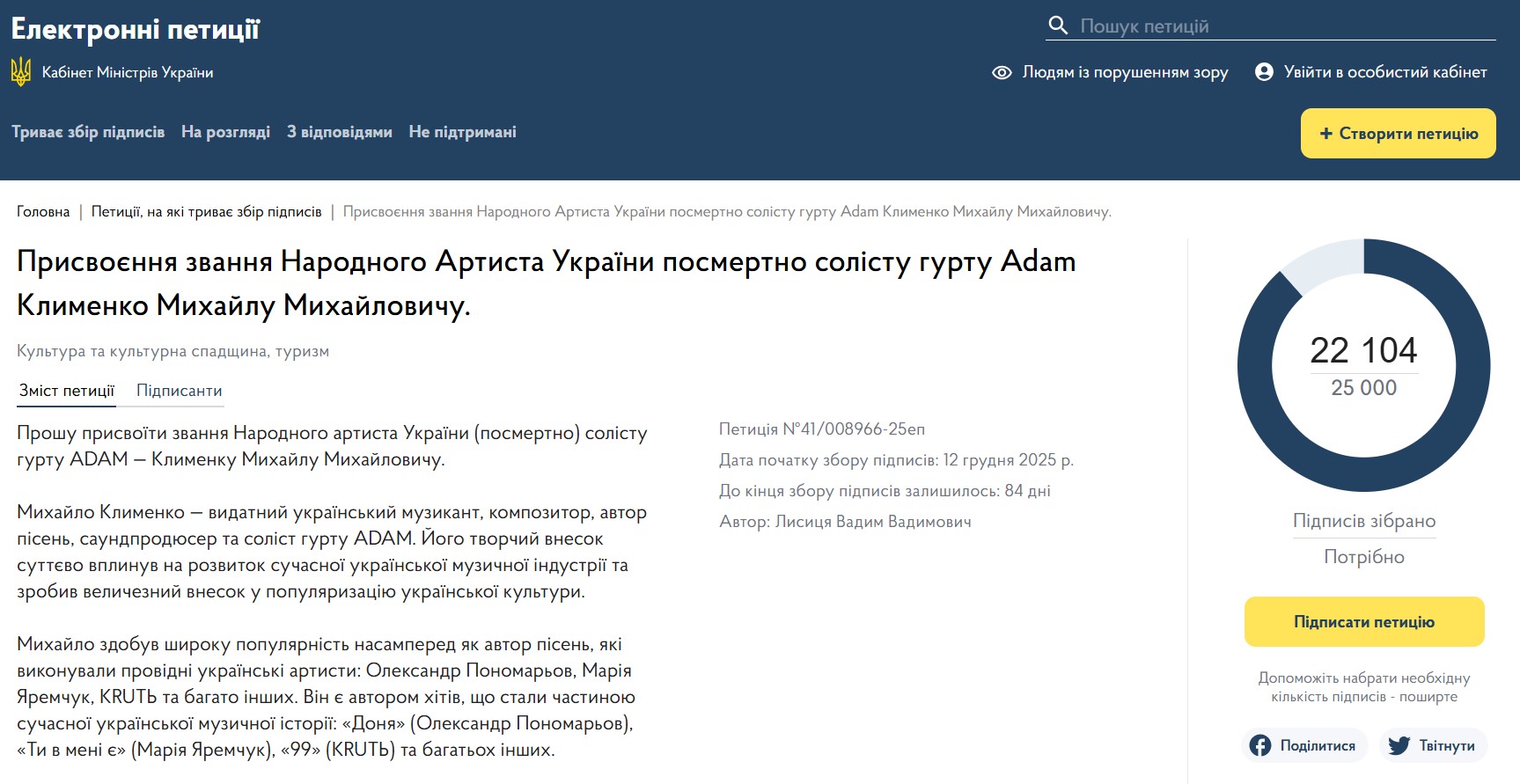 Виконавцю Михайлу Клименку, фронтмену гурту Adam, закликають присвоїти звання народного артиста України посмертно.