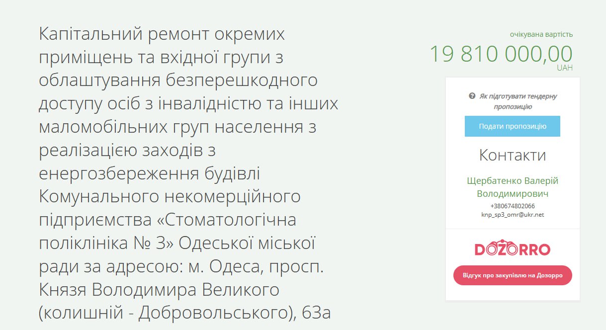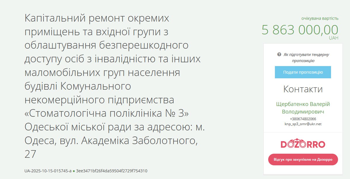 В Одесі продовжують створювати комфортне середовище для людей з інвалідністю. Стоматологічна поліклініка №3 Одеської міської ради оголосила тендери на «капітальний ремонт окремих приміщень та вхідної групи з облаштування безперешкодного доступу осіб з інвалідністю та інших маломобільних груп населення» двох своїх локаціях: на проспекті Князя Володимира Великого (колишній - Добровольського), 63а та вулиці Академіка Заболотного, 27.