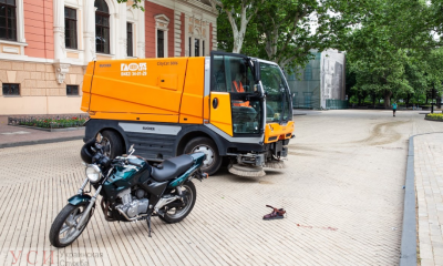 В воскресенье утром, 26 мая, на Думской площади возле Археологического музея произошла авария. Мотоцикл на скорости влетел в уборочную машину.