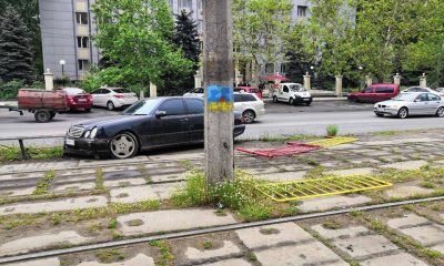 На улице Балковской напротив Приморского райсуда водитель Mercedes снес трамвайные ограждения и скрылся.