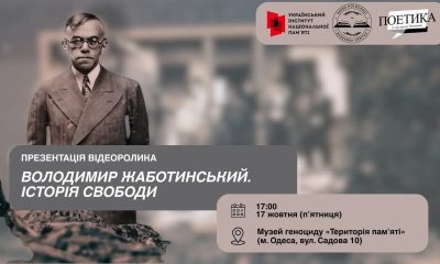 У Музеї геноциду «Територія пам'яті» 17 жовтня відбудеться показ ролика «Володимир Жаботинський. Історія Свободи». Проєкт був реалізований Українським інститутом національної пам'яті, а режисеркою та авторкою сценарію виступила одеська журналістка Світлана Пензова.