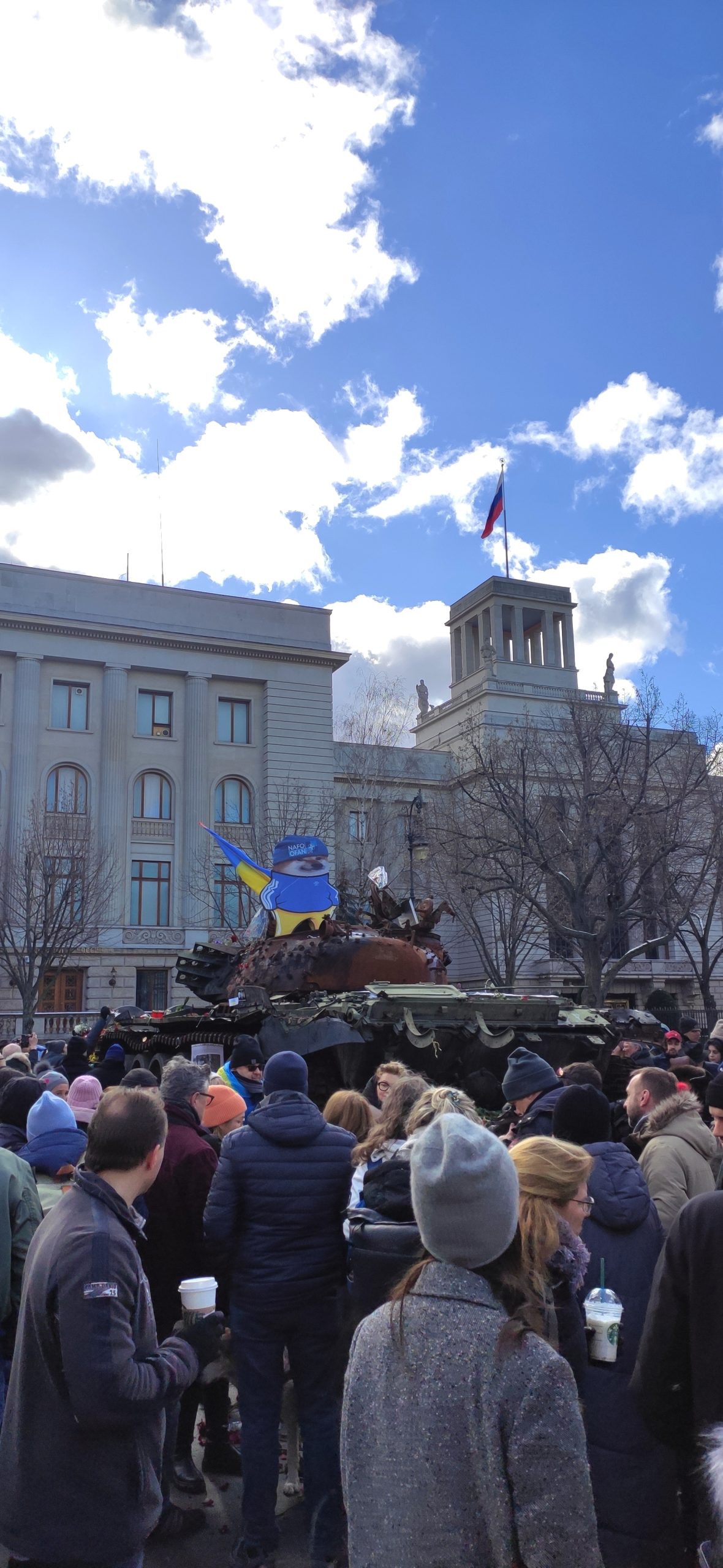 Сотні людей прийшли до посольства росіян на підтримку України. До танку зносять квіти, фотографії окупантських злочинів. Люди скандують патріотичні лозунги нашої держави.