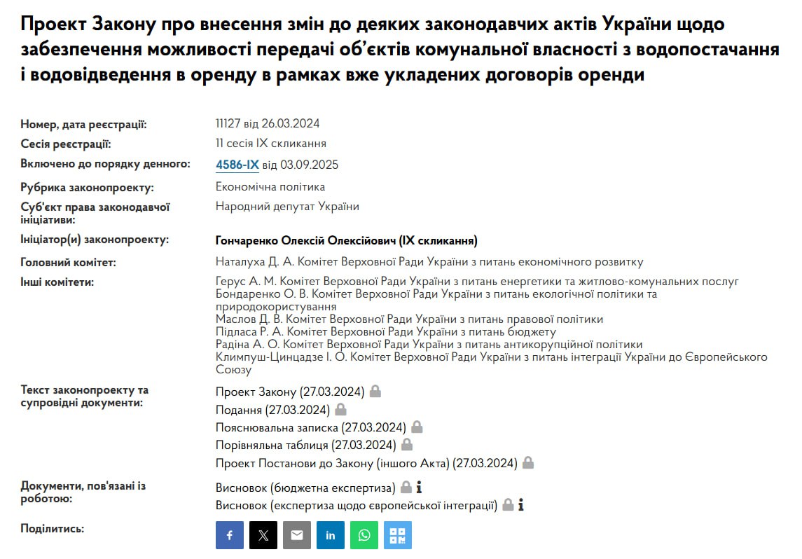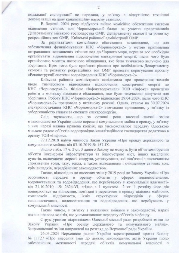 У 2024 році структурні підрозділи міської ради ініціювали зміни до законодавства, щоб передати станцію в оренду Інфоксводоканалу. На цей час Законопроєкт № 11127 депутати ВР ще не прийняли.